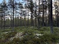 Jeg gikk rett opp skråningen og innover til Langfosshøgda. Det er ingen stier her, men ganske grei lyngvandring i åpen skog. Selve toppen lignet veldig på resten av området, bortsett fra den svake forhøyningen. Jeg fortsatte innover forbi Svarttjenn, over høyde 348 og helt inn til Langfosshøgda NØ. Her var det helt annet landskap med flotte berg og gamle furutrær. Fin topp men uten markering eller utsikt.