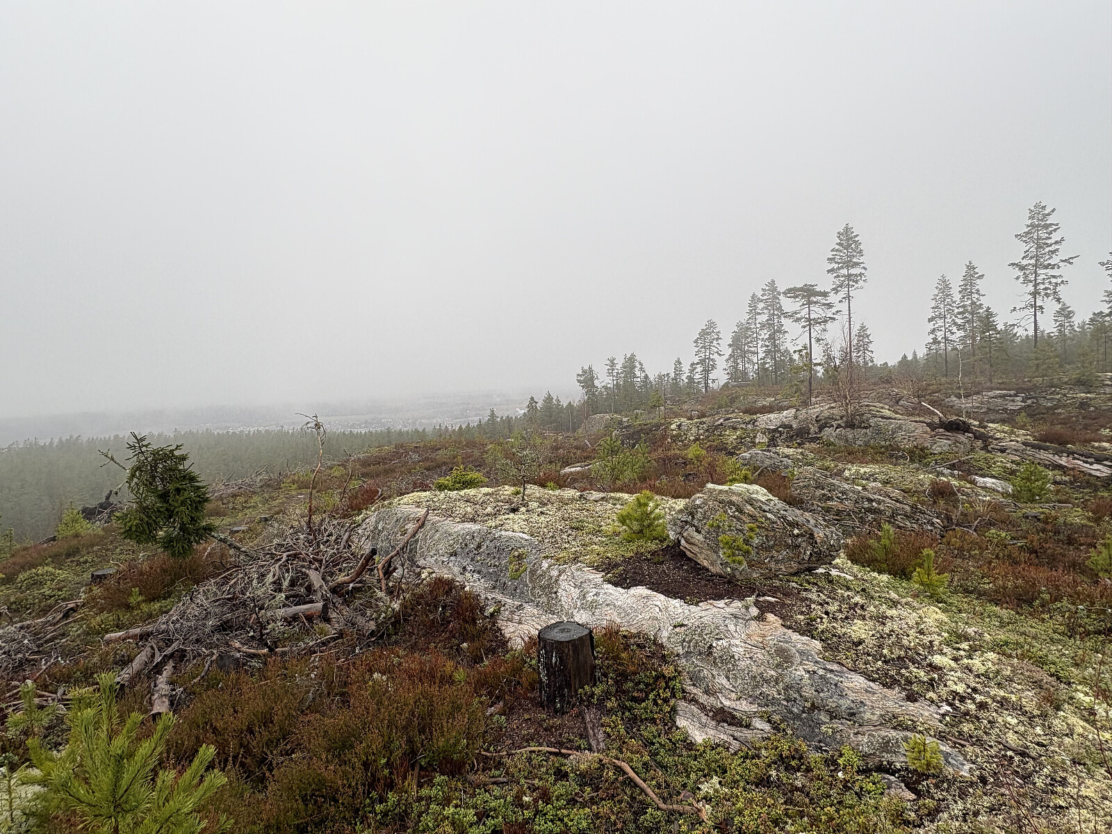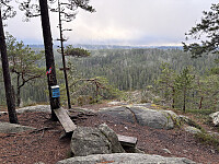 Jeg kom nordfra og kjørte mange kilometer på skogsbilveier (2 betalinger) før jeg til slutt parkerte rett nord for toppen. Herfra ble det bushing opp til toppen. Litt spredt sikt mellom trærne underveis, men ingen vidstrakt utsikt. Selve toppunktet var markert med en liten steinvarde.
