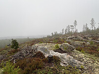 For å få til en liten rundtur gikk jeg over til Tjuvdalshøgda, før jeg stort sett fulgte høyspenttraseen tilbake til veien. Heller ikke denne toppen kunne imponere med fin utsikt, og i tillegg var den utpreget flat og uten noe naturlig toppunkt.