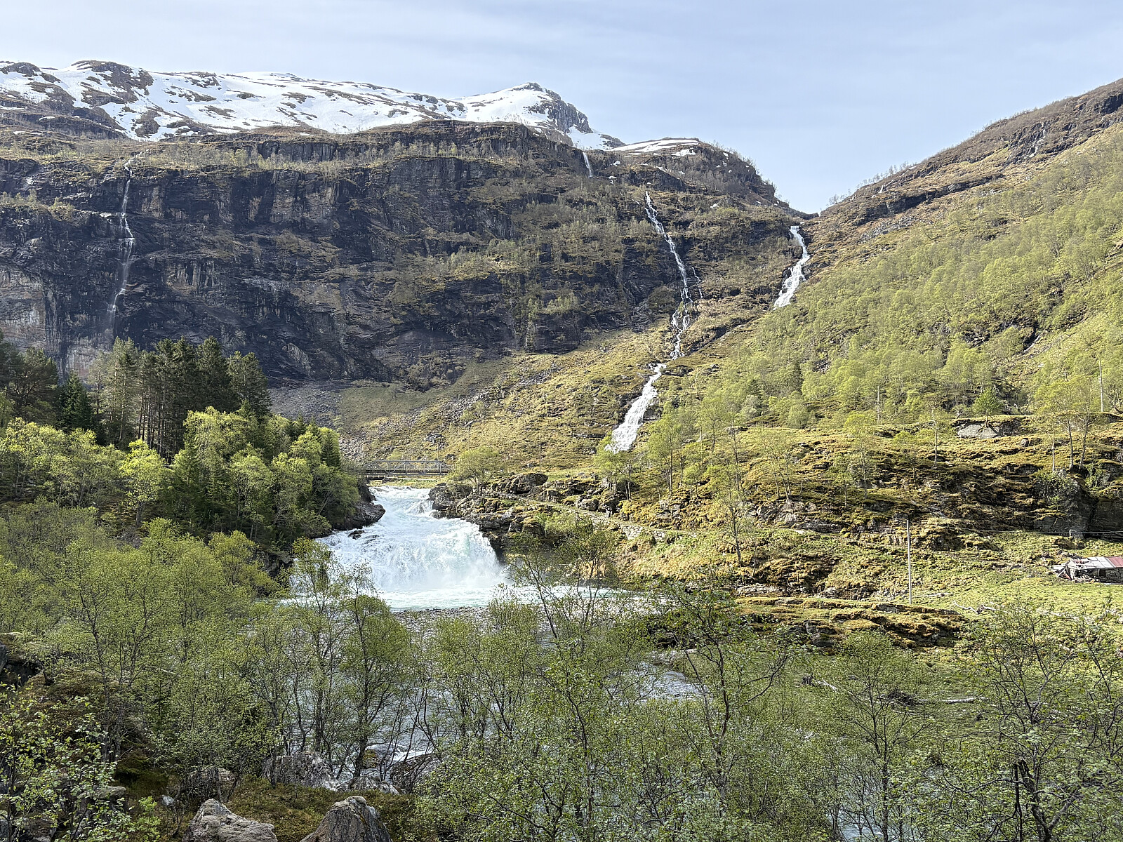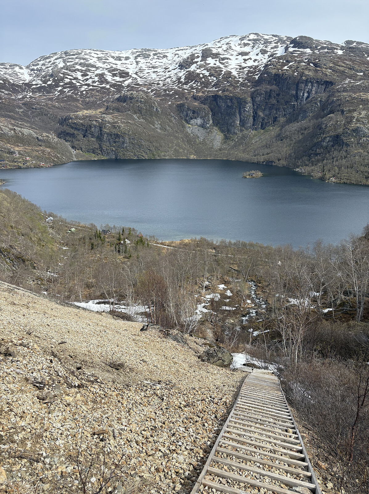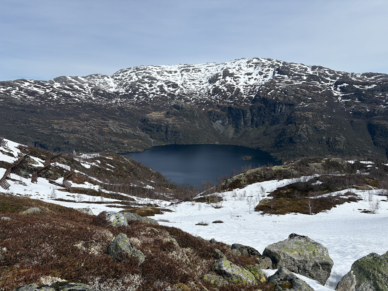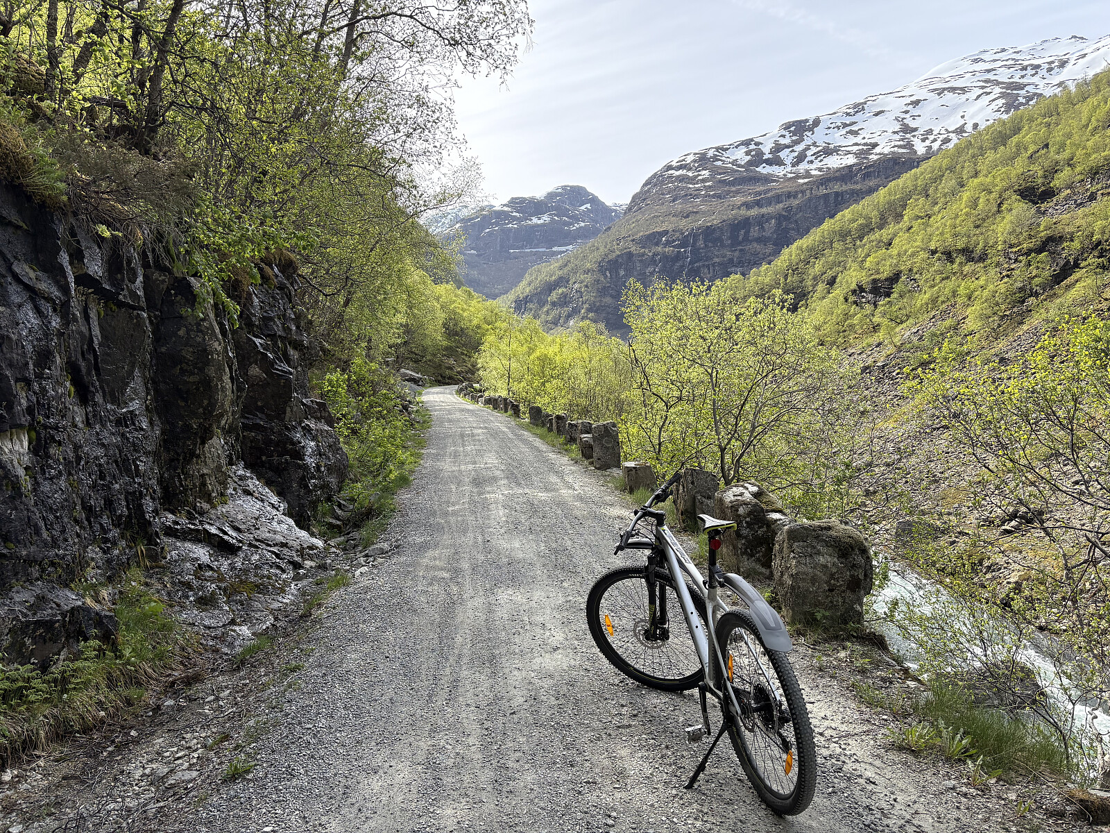 Jeg kjørte oppover Flåmsdalen så lang det var lovlig, og parkerte på p-plass like etter Blomheller stasjon. Herfra var det på med trugesekk, staver og stor niste for så å sykle videre oppover dalen. Det gikk i godt tempo frem til svingene, herfra ble det leiing av sykkel opp alle hårnålssvingene. Jeg hadde ikke hastverk oppover her, bare passet på å ikke bli forbigått av alle turistene:) Ved Vatnahalsen øverst i bakkene tok jeg en pause mens jeg så på de som tok zip-line ned igjen til Kårdal. Dette ser veldig fristende ut, men denne dagen hadde jeg andre planer! Jeg syklet videre østover og satte fra meg sykkelen omtrent midtveis langs Reinungavatnet. Herfra går det en sti bratt oppover lia retning Styvidalen. Det ble litt klyving oppover mot jernbanelinja da det lå igjen en del snø i bratthellingene her. Undergangen under jernbanen var nok mer beregnet for elva som rant der enn for turgåere; både var det god vannføring denne dagen samt at deler av plankene/steinene som var lagt ut lå under vann. Med god hjelp fra stavene og litt utplassering av et par steiner kom jeg da noenlunde tørrskodd gjennom. Vel på andre siden var det på med truger og så kunne endelig selve turen opp mot toppen starte!