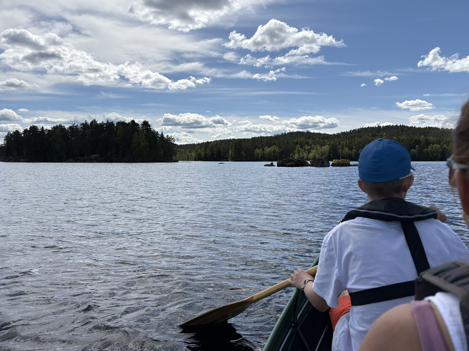 Neste mål var riksrøys 55 som skulle ligge helt i nordenden av innsjøen. Da vi kom dit viste det seg at det var litt vanskelig å komme seg fra kanoen og bort til riksrøysa. Hele kanten rundt besto av synkemyr med noen råtne planker på, så her måtte man trå varsomt! Cecilie og Kristian syntes de var nærme nok og valgte å bli i kanoen, og hadde det nok festlig ved å se på den barbeinte samleren på sin ferd bort til røysa. Det gikk på et vis, men jeg må innrømme at det var en lettelse å komme seg tilbake opp i kanoen igjen etterpå etter endt oppdrag!