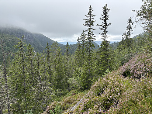 Vel tilbake igjen ved snuplassen valgte jeg å gå forbi bilen og videre oppover lia som var sterkt preget av hogst og kraftige hjulspor! Det var såpass klinete at jeg valgte å gå ved siden av sporene på vei opp mot Gråskallen. Like før jeg var oppe kom jeg til et meget bratt og litt kronglete juv mellom fortoppen og selve toppkollen. Her ble det 2-3 meter med litt klatring før jeg kunne rusle siste biten opp til Gråskallen. Det er mulig å omgå dette partiet ved å gå litt nordover ned langs skaret før man går opp på ryggen. Jeg valgte denne ruta ned igjen. Gråskallen var for øvrig en fin og artig topp med en stupbratt side ned mot sørvest. Fin utsikt tilbake mot Sauflag og områdene rundt.