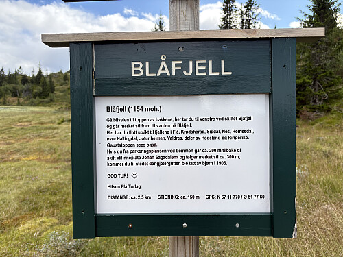Jeg kjørte nesten helt frem til kommunegrensa hvor veien merkbart ble dårligere og parkerte like ved et turskilt. Her er det plass til 3-4 biler. Jeg fortsatte til fots omtrent en kilometer videre langs veien til det gikk av en sti til venstre. Denne skulle vært skiltet, men dette så jeg ikke noe til. Uansett var stien fint merket og såpass tydelig at den var grei å følge helt opp til Blåfjell. Stor varde og mange skilt på toppen. En utrolig vid og flott utsikt! Samme vei tilbake.