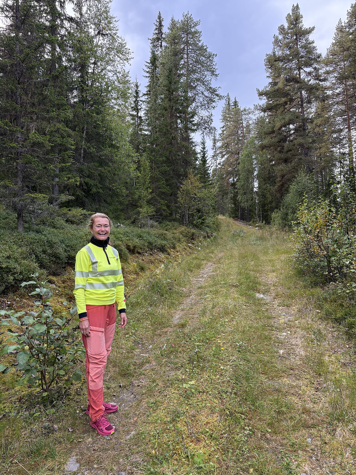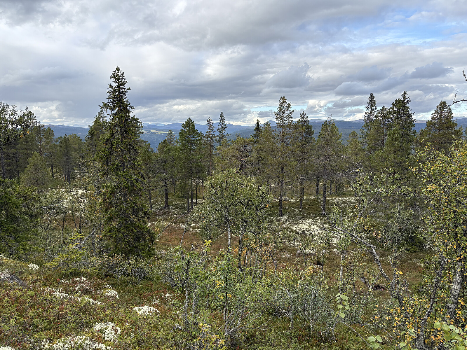 Det var akkurat plass til å parkere der hvor traktorveien starter nord for Strutsberget. Vi fulgte traktorveien bratt oppover til den flatet ut og begynte å helle litt nedover igjen. Her gikk vi ut fra stien og fulgte mosen og lyngen i relativt åpent skogsterreng opp til toppen. Det var stedvis litt ulendt og steinete, men dette ble kompensert med enorme mengder blåbær :) Toppunktet var en åpen kolle som ikke var markert, men som kunne by på en fin utsikt mot nord. Vi tenkte det kunne være litt bedre utsikt lenger vest og fortsatte vestover til trigpunktet. Dette noe lavere punktet på ryggen åpenbarte ikke noe forandring utsiktsmessig men til gjengjeld var det satt opp en liten varde.