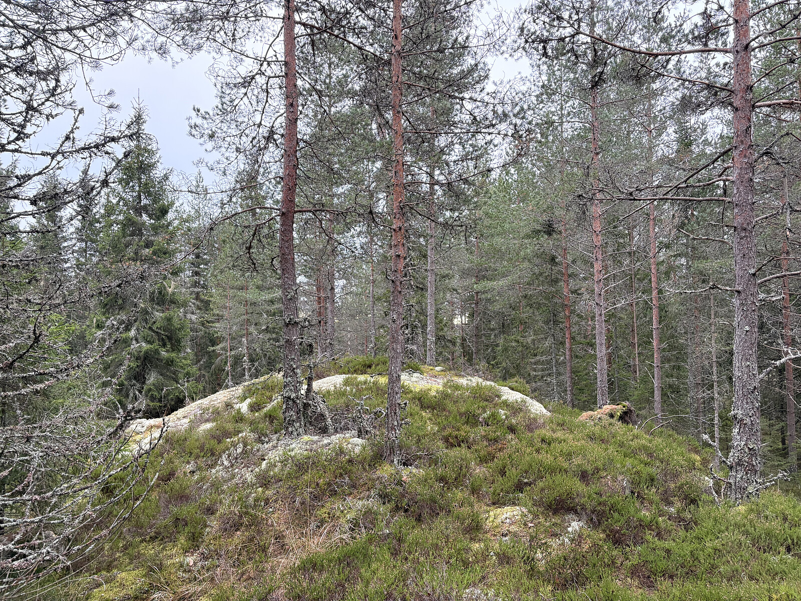 Etter besøket på Heiberget kjørte jeg tilbake igjen langs skogsveien og tok så første til høyre slik at jeg kom over til kollen et hakk lenger nord. Jeg parkerte på en egnet lomme og fulgte en traktorvei opp til et hogstfelt. Herfra ble det litt snublete gange videre opp til grensegata og riksrøys 95. Også her måtte en liten utenlandstur til for å komme opp til toppen. Det var ingen sti å følge østover fra riksrøysa, men likevel greit å gå bort til toppunktet. Skjærberget (Medskogsberget) er en relativt åpen kolle uten utsikt.