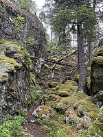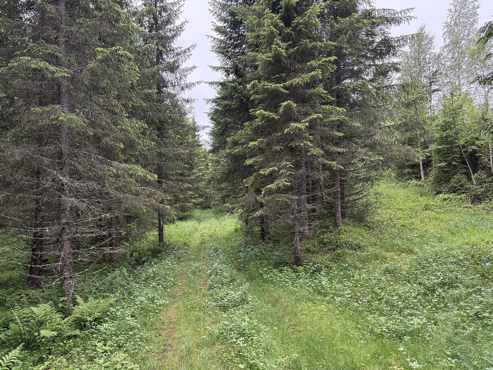 Sør for Åsen stasjon, der hvor E6 passerer på bru over jernbanen, går det av en gårdsvei sørover. Jeg kjørte inn her og fant en fin p-plass like før veien svinger mot høyre. Det ble fottur videre oppover mot toppen. Først gjennom et gårdstun, deretter på sørsiden av neste og frem til jeg hørte hundegnelderet ved den øverste gården. Her var det også skilt om privat grunn, noe som ikke innbød til tur gjennom gården. Løsningen ble å bushe seg rundt i tett kratt og ulendt terreng på nordsiden av gården for etter hvert å jobbe seg oppover mot toppen. I bratthellingen var det antydning til en sti et lite stykke samt at det var lagt ut et tau, men man skal ha litt flaks for å treffe på den. Resten av turen opp til toppen gikk i vanlig skogsterreng med enkelte fine utsiktspunkter >>>