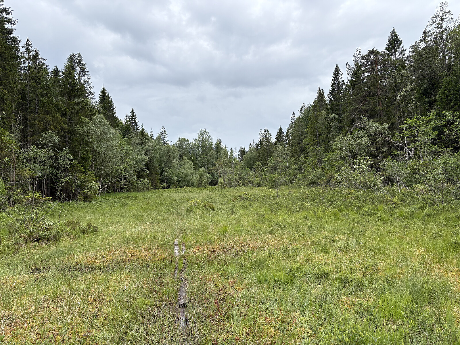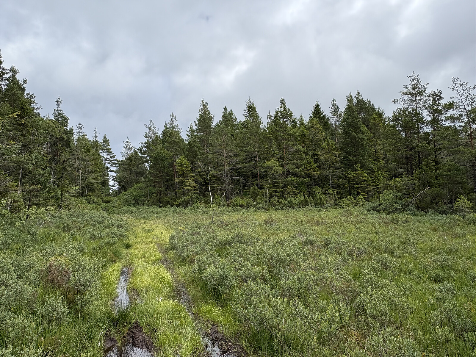 Videre bort til toppunktet var det fint skogsterreng å ferdes i, noe småkupert men fint å gå. Toppunktet var relativt åpent og markert med en liten varde, men heller ikke her var det noe utsikt å snakke om. Tilbaketuren gikk rett ned fra toppen, ganske tilsvarende ruta jeg valgte oppover.