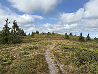 Jeg parkerte i en veilomme der hvor bomvei opp mot vestenden av Nord-Mesna går inn fra. Herfra gikk jeg litt innover veien frem til der hvor stien var avmerket på kartet. Stien var ikke lett å se i det lange sivet, men da jeg først hadde funnet den var den grei å følge innover åsryggen. Snart ble stien mer tydelig og jeg kunne følge denne til jeg var 150 meter unna toppen. Underveis fikk jeg fint utsyn ned mot Nord-Mesna enkelte steder. Det siste stykket til toppunktet ble litt bushing i tett skog, ingen utsikt fra toppen.