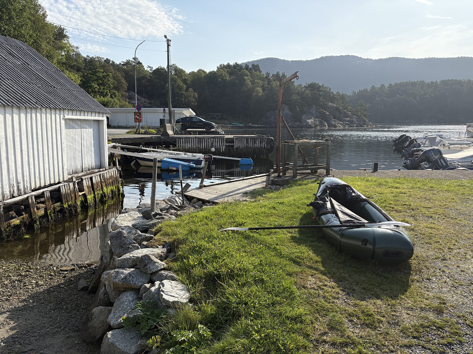 Jeg kjørte ned til kaia på Steinsvik og parkerte her. Det tok ikke mange minuttene å blåse opp packraften og etter 20 minutter var jeg klar til å padle av gårde. Med et par lykkeønskninger fra et par båteiere på kaia var jeg på vei utover. Bortsett fra at jeg etter en stund sprutet såpass med åren at jeg ble våt i rompa gikk dette over all forventning. Det blåste litt utpå fjorden men man sitter såpass dypt at det kjentes trygt og fint ut:)