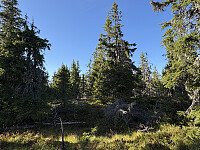 Jeg parkerte i en veilomme der hvor bomvei opp mot vestenden av Nord-Mesna går inn fra. Herfra gikk jeg litt innover veien frem til der hvor stien var avmerket på kartet. Stien var ikke lett å se i det lange sivet, men da jeg først hadde funnet den var den grei å følge innover åsryggen. Snart ble stien mer tydelig og jeg kunne følge denne til jeg var 150 meter unna toppen. Underveis fikk jeg fint utsyn ned mot Nord-Mesna enkelte steder. Det siste stykket til toppunktet ble litt bushing i tett skog, ingen utsikt fra toppen.