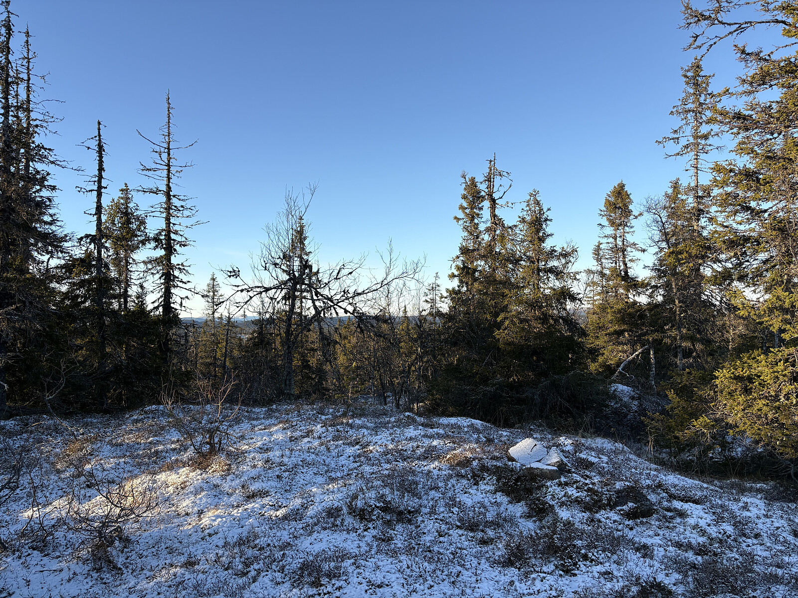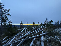 For å få til en liten rundtur gikk jeg over til Tjuvdalshøgda, før jeg stort sett fulgte høyspenttraseen tilbake til veien. Heller ikke denne toppen kunne imponere med fin utsikt, og i tillegg var den utpreget flat og uten noe naturlig toppunkt.