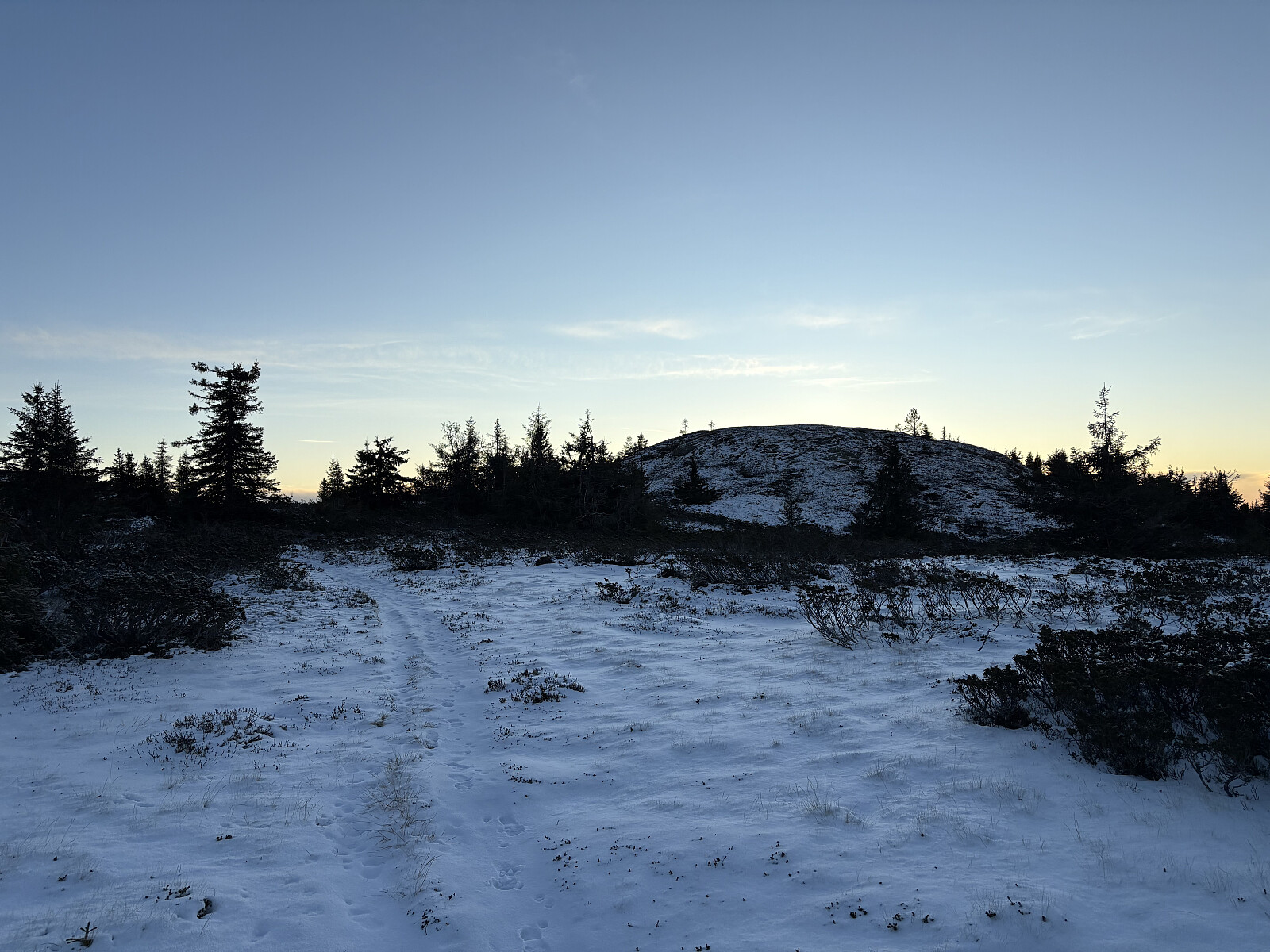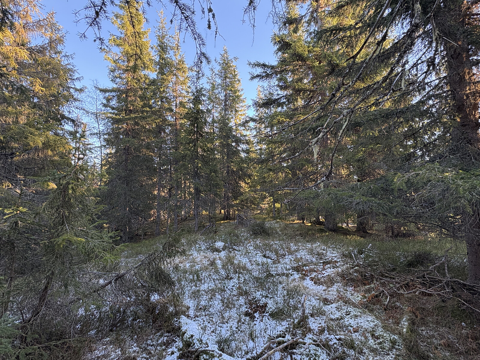 Jeg kjørte til Fossum og parkerte i en lomme rett på utsiden av bommen. Herfra fulgte jeg skogsveien til veis ende og videre i lyngterreng opp til Svarttjennhøgda. En ganske åpen kolle uten utsikt. Et par bolter viste spor etter et tidligere trigpunktmerke, ellers ingen markering.