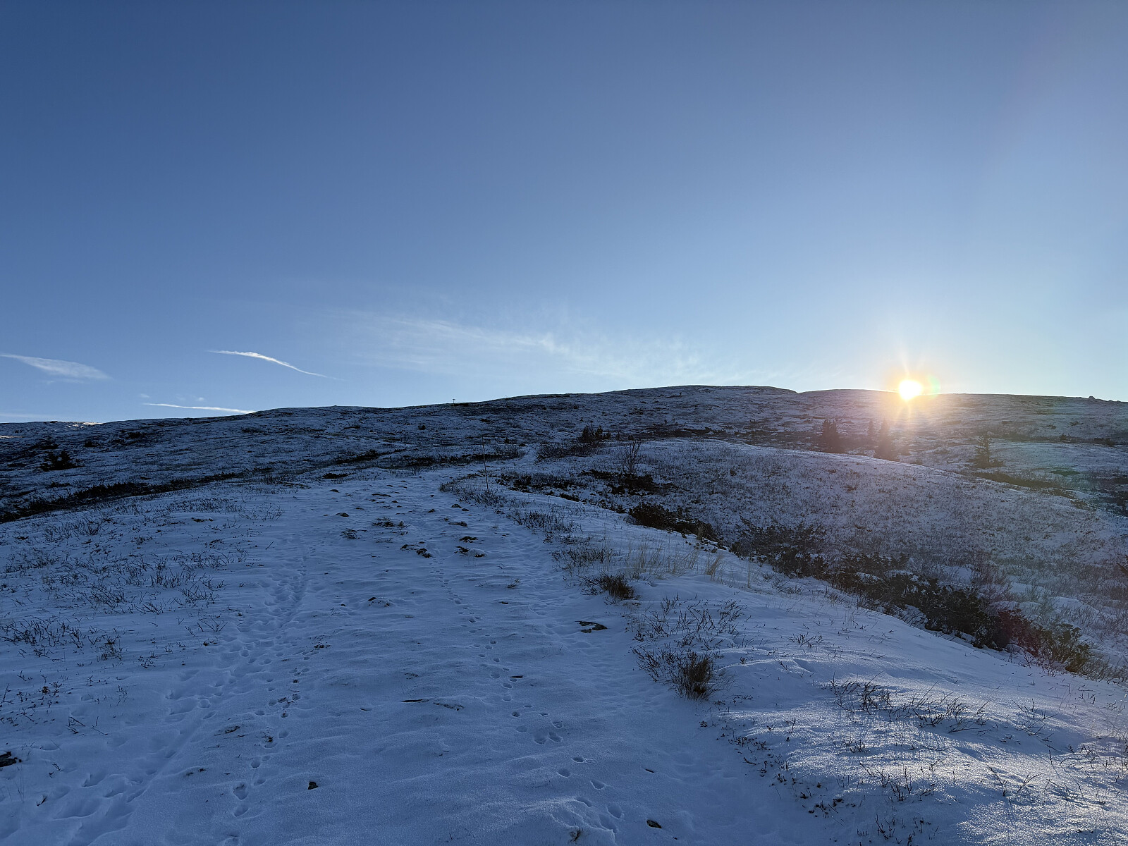 Fra Nylsfjellet kjørte jeg videre nordover og svingte inn i et hyttefelt omtrent halvvegs langs Synnfjorden ved en alpinbakke. Her var det ingen bom eller forbudsskilt så jeg kunne kjøre gjennom hyttefeltet og parkere i en lomme helt øverst. Herfra fulgte jeg merket/skiltet sti til toppen av Skjervungfjellet. Flotte omgivelser med litt nysnø, sol og vindstille vær. Fin utsikt over til blant annet Spåtind i vest.