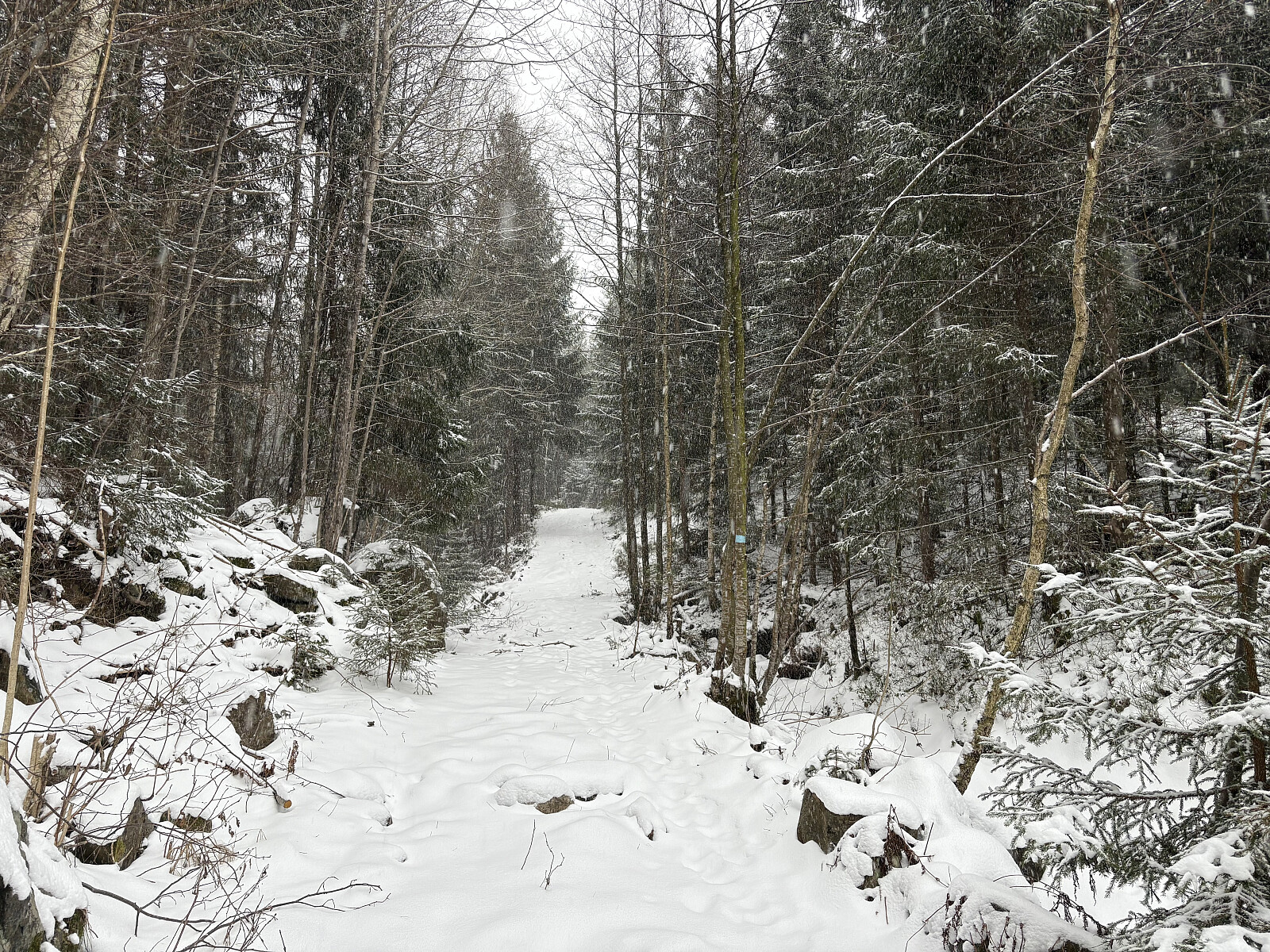 Jeg fant den gulmerkede stien like nedenfor toppunktet og fulgte denne ned igjen. Her var det ingen problemer med bratthet eller is men jeg kom ned et stykke lenger inn langs stikkveien.