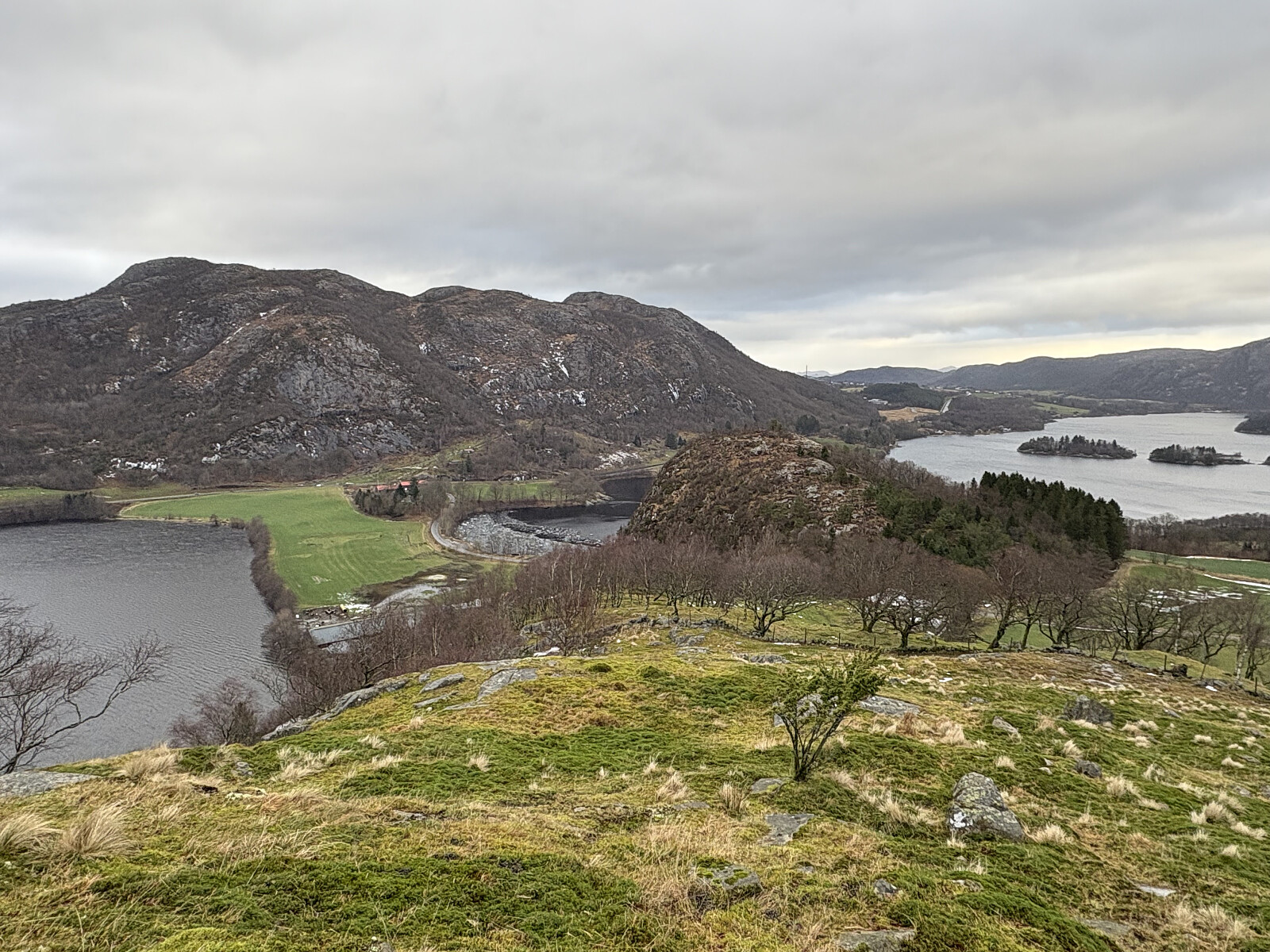 Jeg kjørte til den østre delen av Mosterøy og tok av ved Kiwi. Omtrent 300 meter nord for butikken var det en fin lomme å parkere på like ved der stien starter. Det gikk ganske greit å følge stien oppover, men enkelte steder var den ganske gjengrodd. Askjevarden er ikke markert på noen måte, noe man skulle tro etter navnet å dømme. Toppen er fri for trær og byr på fin utsikt i alle retninger. På tilbaketuren gikk jeg bortom nabokollen, Norevarden, før jeg fulgte en annen gjengrodd sti ned igjen.