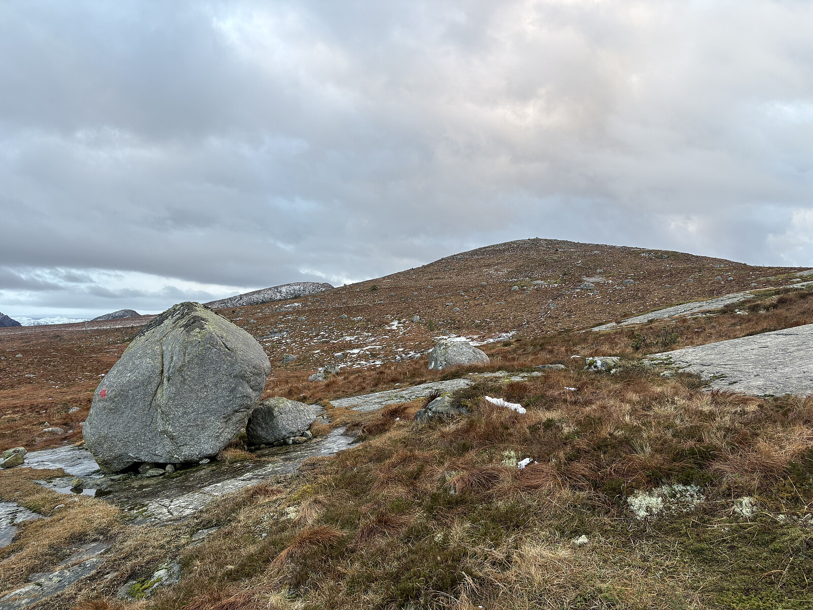 Jeg parkerte i en lomme langs Kristiansandveien der hvor en stikkvei retning toppen går sørover. Etter å ha kommet forbi bolighuset fulgte jeg et traktorspor videre inn til snuplassen. Det var overraskende mye snø i terrenget og ekstra mye ble det fra snuplassen og opp til toppen hvor det ikke var noe slags spor å følge. Underveis opp mot toppen ble det etter hvert vid utsikt nordover. På selve toppkollen var det bart berg og en liten varde. Noe utsikt herfra.