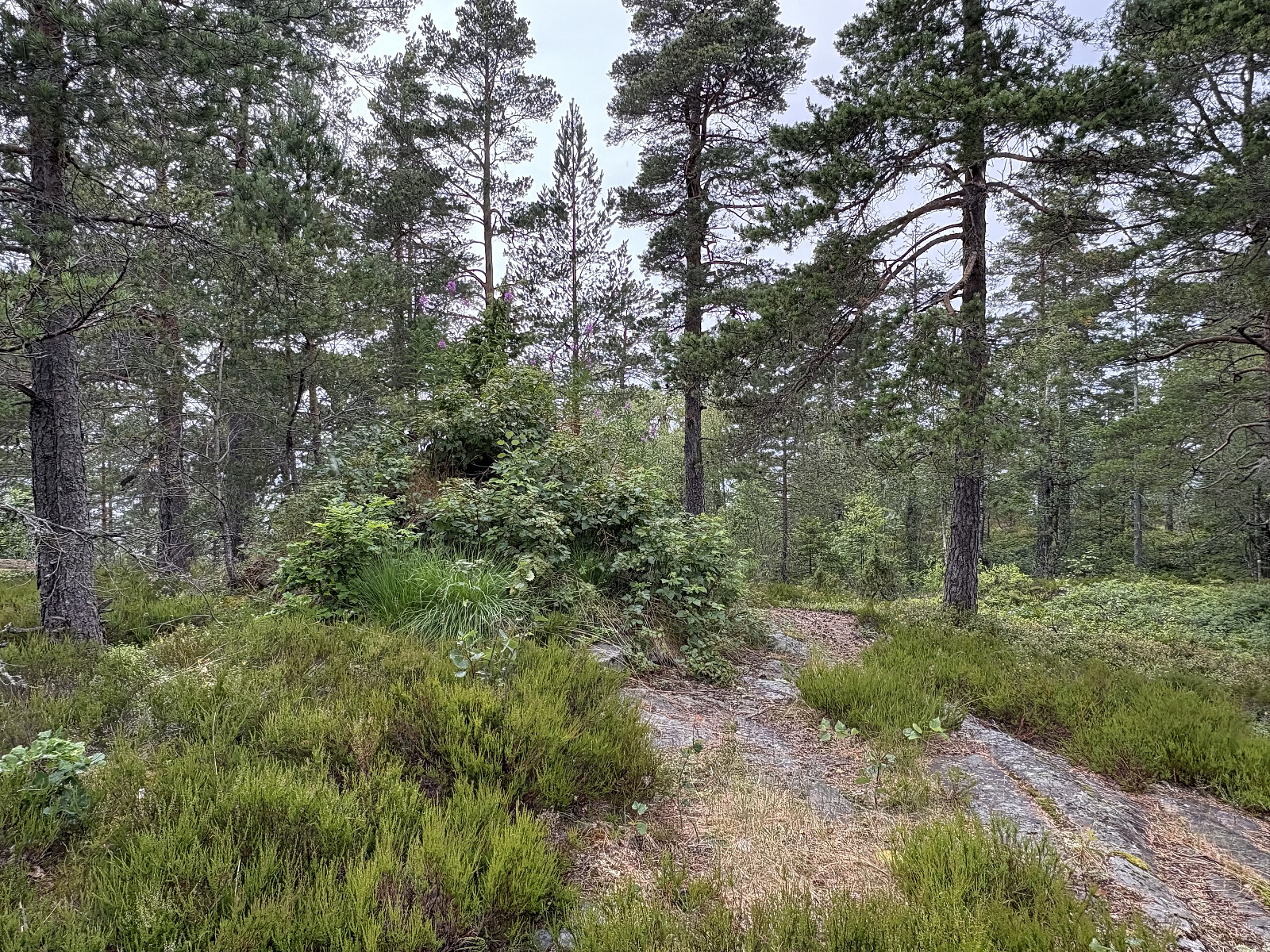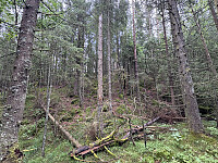 Videre bort til toppunktet var det fint skogsterreng å ferdes i, noe småkupert men fint å gå. Toppunktet var relativt åpent og markert med en liten varde, men heller ikke her var det noe utsikt å snakke om. Tilbaketuren gikk rett ned fra toppen, ganske tilsvarende ruta jeg valgte oppover.