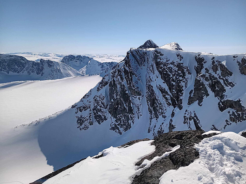 Der var`n jo også, og den kunne være så nerdete den bare ville, Skarvflyløyfttinden SØ1 er en herlig topp! Her er det jaggu tett inn på store flotte saker. Det er langt ned til breene på to sider, og på tredje siden er man så kloss innpå den flotte ryggen alle ser på langt hold fra Valdresflya, den som går fra hoved-Skarvflyløyfttinden til selveste Austre Leirungstinden. Alt dette i kremvinterdrakt under deilig intens sol og såkalt påskevær, det kunne faktisk ikke bli stort bedre! Utslitt og deppa over egen form til tross, jeg var så fantastisk fornøyd med turen og utsikten og kjente nok en gang hvordan hjertet mitt banker aller mest for Gjendealpene! Både Hurrungane og Lyngsalpene er råere og flottere enn Gjendealpene, men det er alltid noe som er "bedre". Men best/flottest betyr ikke nødvendigvis kjærest. Joda, jeg har en såkalt kjærestetopp borti Vest-Jotunheimen som heter Stølsmaradalstinden, og det må den bare fortsette å være, men Gjendealpene er hjemme! Jeg vet at Gjendealpene er 80-90% Vågå kommune, men for meg så er dette Valdres. Og Valdres er også lik hjemme, og Fønhus og deler av Vassfaret og alt det der. Jaja, det sklir ut, men Gjendealpene er fysisk sett også min nærmeste del av Jotunheimen. Og for noen opplevelser de har gitt meg i åras løp... Jeg elsker Gjendealpene!!!