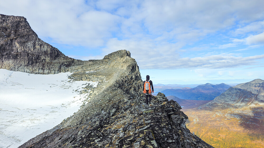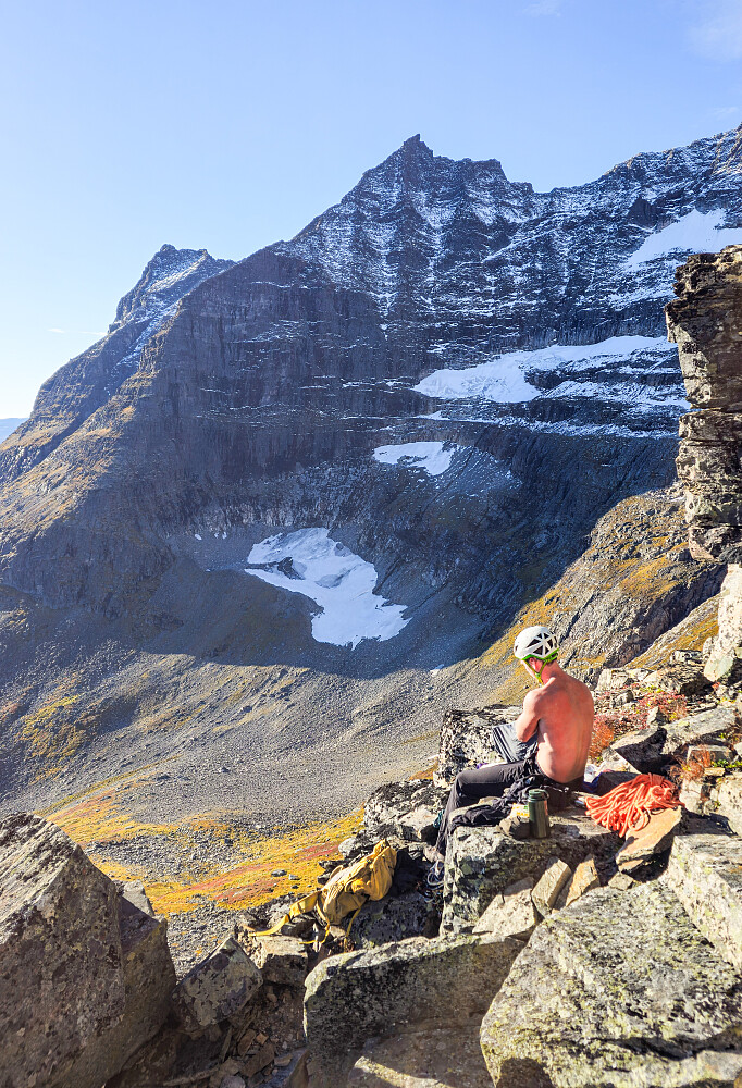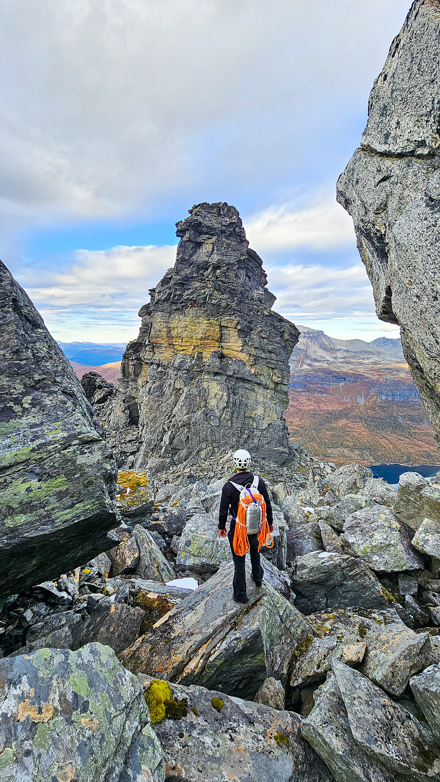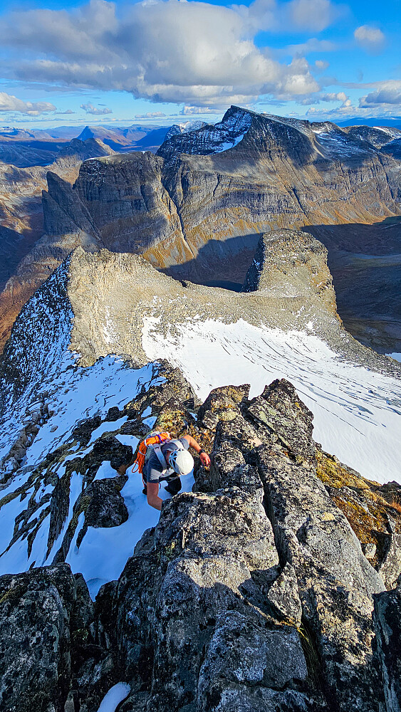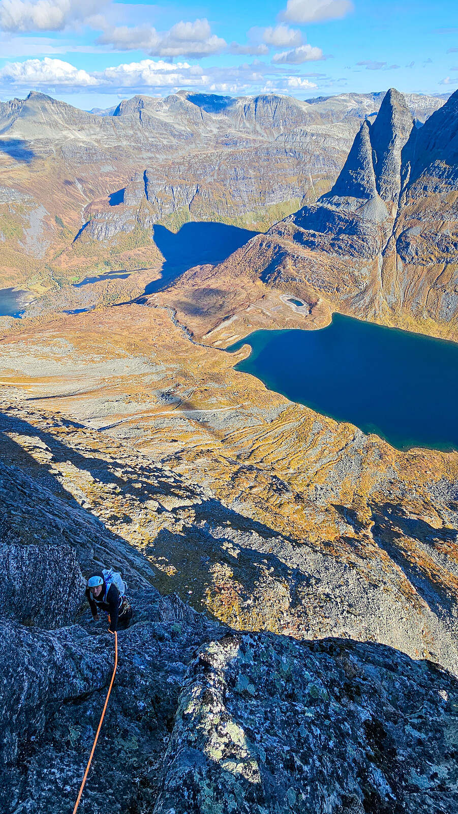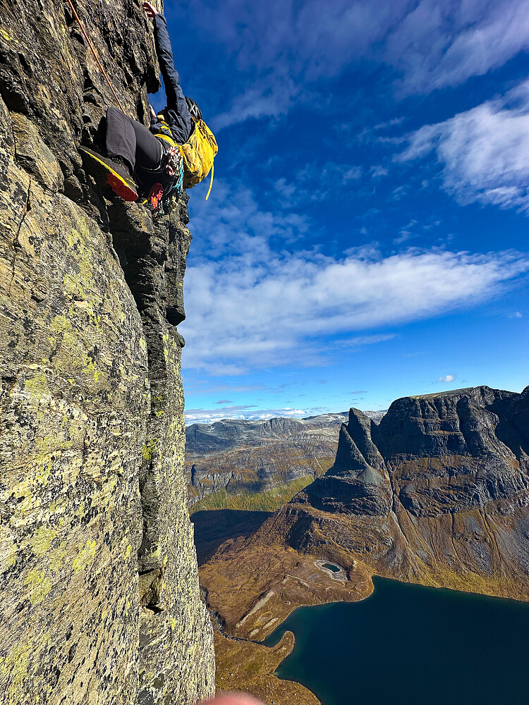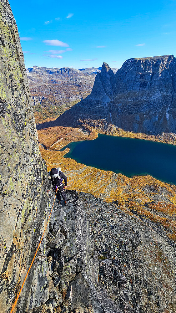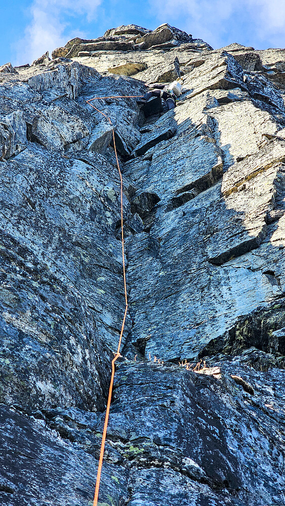 Særdeles artig og fin klatring opp sørøsthjørnet i utrolig varmt, fint og tørt høstvær! Tror vi traff godt på ruta, men klatringa føltes hardere enn gradert mange steder! Alexander Udnes med på turen.