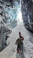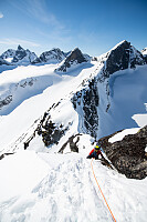 Føringstur for å komplettere Hurrungane 30pf-lista for Olve. Ønsket var de tre siste toppene Austre Ringstind, Store og Nestnørdre Midtmaradalstinden. Dagen startet med noen logistikkmessige utfordringer da nøkkel til østlig bom på Sognefjellet hadde kommet bort. Fikk etter hvert løst problemet, men mistet en time her så nå var utfordringen å rekke hele denne turen før bommen stengte igjen kl 20.00. Antok at turen fort ville ta 11-13 timer. Rutevalgene for mest effektiv løsning hadde jeg stort sett i hodet fra tidligere turer. Et ønske fra både gjest og meg selv var å rappelere ned Halls hammer på nordryggen til Store Midtmaradalstinden, så det var nok der største utfordringen lå i forhold til bortsløsing av tid. Startet i fin vårtemperatur ved Tindeveien, gikk raskt innover >>>