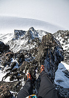 Første miksklatretur (rute Centraltind ad høyde WI3 M4). Boka beskriver ei rute som krever god snø da det er vanskelig å sikre. Viste vi hadde elendig snø, men gjorde et forsøk allikevel. 900 høydemeter opp bratt renne, ordentlig tøffe terrengformasjoner oppi her! Nødbail etter 30m klatring på grad M4 (brukte 3 timer på dette).