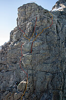 Dette er en lengre rapport av føringsturer, egne turer og rekognoseringsturer jeg har gjennomført til Store Skagastølstinden , over Skagastølsryggen og Styggedalsryggen. Selve føringsturene har vært i regi av Jotunheimen Arrangement . Etter over 100 turer inn i området her besitter jeg mange bilder som både vil inspirere og være til god hjelp for andre som planlegger tur hit, enten om de vil ha fører eller planlegger å gå turen selv. Jeg har prøvd å beskrevet rutene ned i detaljert nivå og skrevet litt om risikoen ved de ulike valgene man kan ta. Allikevel er jeg langt fra utlært, og vil aldri bli det heller i et såpass komplekst terreng så om ti nye turer kan det hende jeg må skrive om noen detaljer her. Artikkelen er delt i tre deler og beskriver Normalruta opp til Storen (rød rute på kartet), Skagastølsryggen (blå >>>