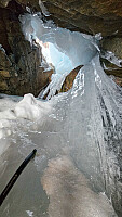 80m opp i renna ligger ei stor steinblokk sett i bildene under. 20m vertikal klatring på begge sider av denne. Jeg gikk under ettersom lys viste mulig åpning. Isklatring over ca 15m med 70-80 graders helning inn under blokka, grad WI3+. Så ett mer spennende opptak i toppen og ut igjennom snøtunnel. Regner med denne er helt nedsnødd på mer snørike vintre. Måtte ta det pent, rolig og ha fullt fokus på riktig plassering av isøkser >>>