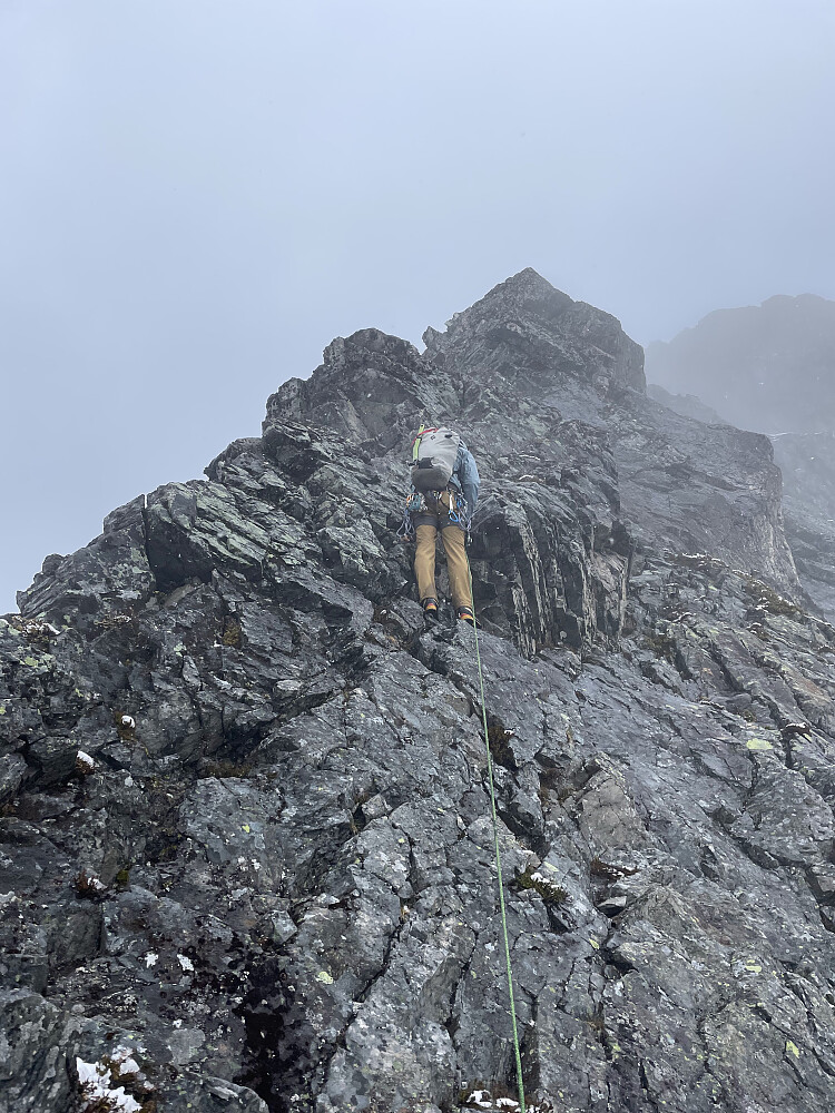 Opptakssamling klatring for tindevegledere ved Norsk Fjellfagskole. Jeg var med som "sensor" for en deltaker (Jonas) på turen over sørryggen på Blånebba. Sti fra Venjesdalsvatnet og opp til selve sørryggen. Måtte krysse et snøfelt undervegs. Selve ryggen byr på mye relevant alpin fjellklatring opp mot grad 3-4, og en del mellomterreng. Returen var lettgått med en god del snø å ake på. Litt utfordrende med tåke ned toppryggen. Fikk haik opp igjen fra bommen etterpå.