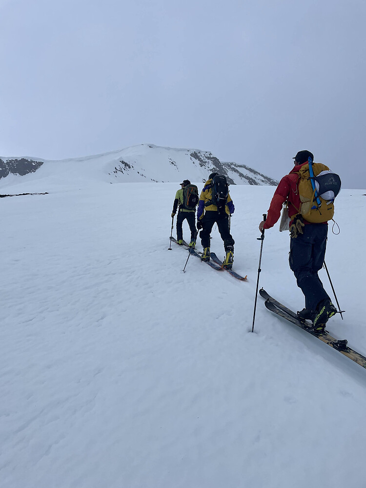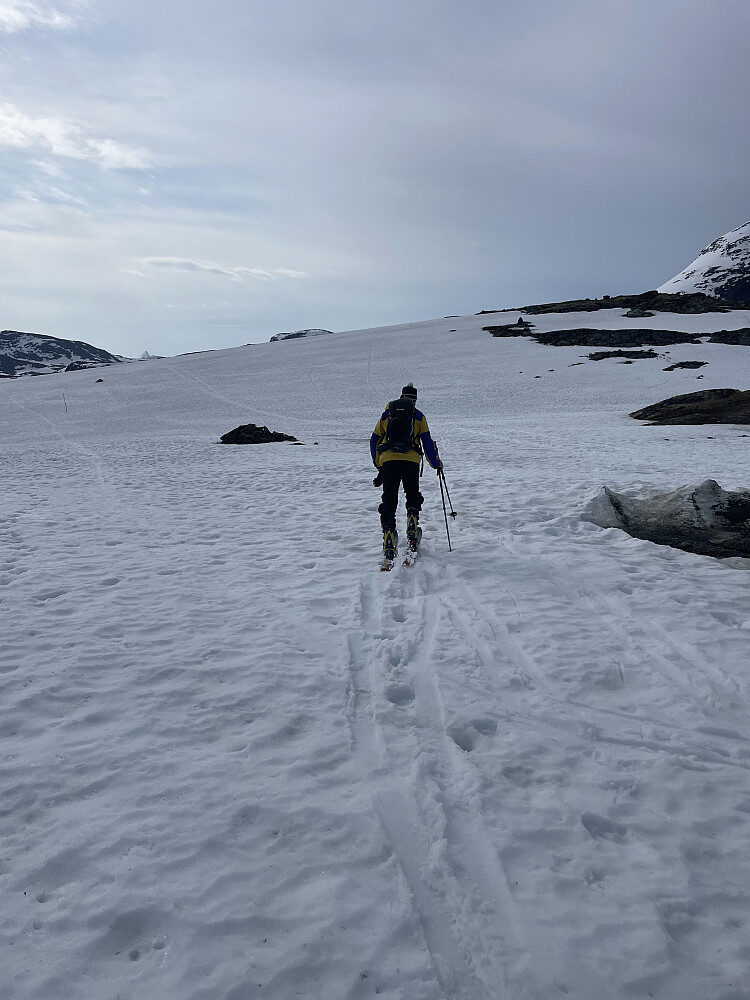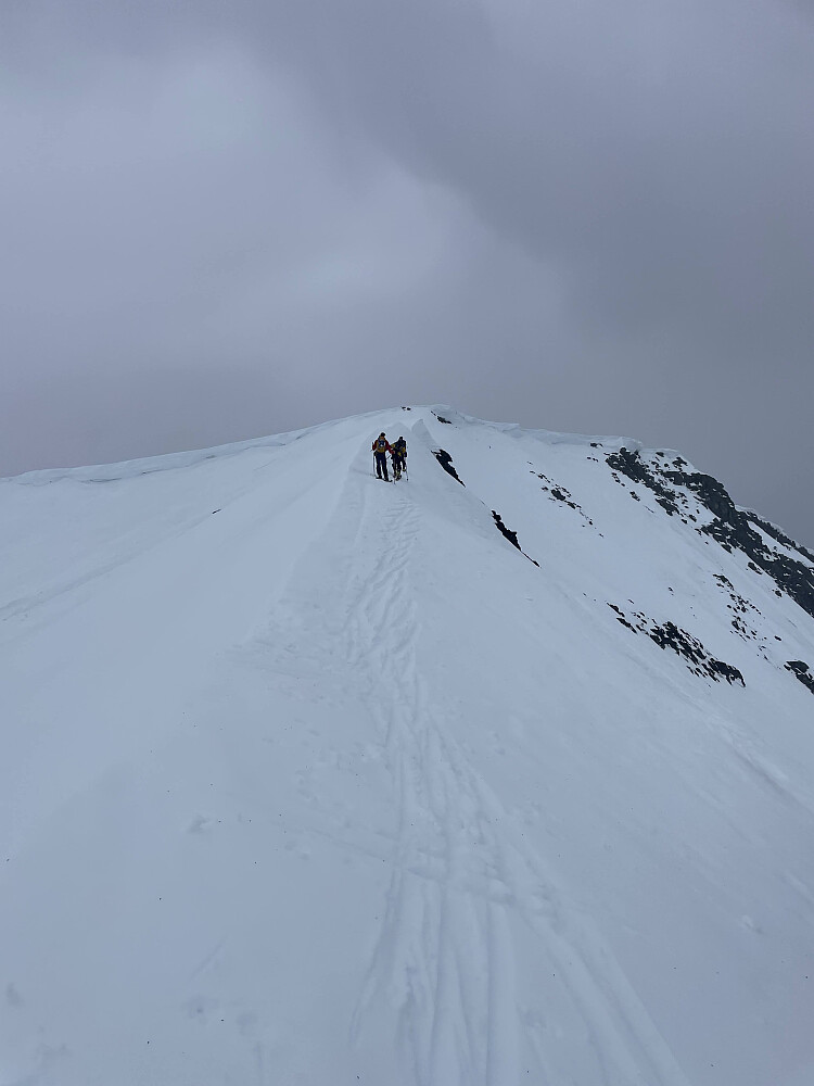 Opptakssamling ski for kommende tinde- og skivegledere ved Norsk Fjellfagskole. I dag var det turdag der jeg var "sensor" for tre deltakere som skulle gå over Steindalsnosi fra øst til vest. En del interessante momenter undervegs som orientering, skredvurdering, brevurdering osv. God sikt denne dagen.