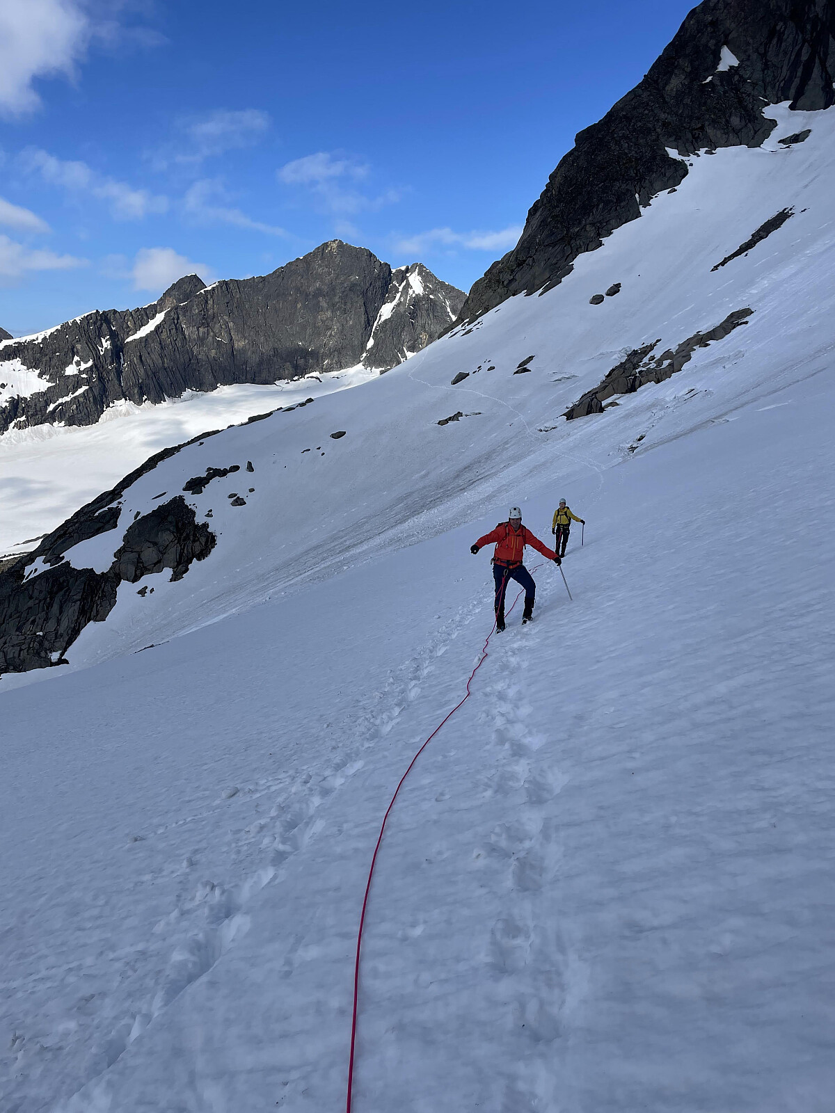 Føringstur til alle 2000-metringene på Maradalsryggen for Geir og Nina. Start fra Skagadalshytta. Fra Slingsbybreen og opp tok vi en direktevariant opp mot Nørdre Maradalstinden som vi brukte opp og ned. Ca. 40 graders snøflanke det meste av veien, men et parti med litt utsatt klyving ut mot venstre der vi brukte tausikring. Ellers var det primært bruk av tausikring to korte taulengder opp mot Sør for Sentraltinden. Greit å omgå Maradalstinden S1 i sørflanken hvis man finner enkleste vei.