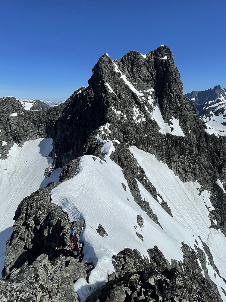 Føringstur for Svein over Austanbotntindtraversen i nydelig vær. Startet fra "vinterparkeringa" siden det var rikelig med snø på utmarsjen. Fant ut at jeg kunne ha kjørt inn og parkert i endeveien 400 meter lenger sør for vår parkering. Greit å vite til senere. Fine forhold over traversen. Vi klatret direktevarianten opp til sørtoppen i to taulengder. Litt småvått et parti, men klarte å bryte oss opp. Måtte fram med stegjerna ca. 30 meter langs en snøegg etter sørtoppen, men ellers hadde vi ikke bruk for dem.