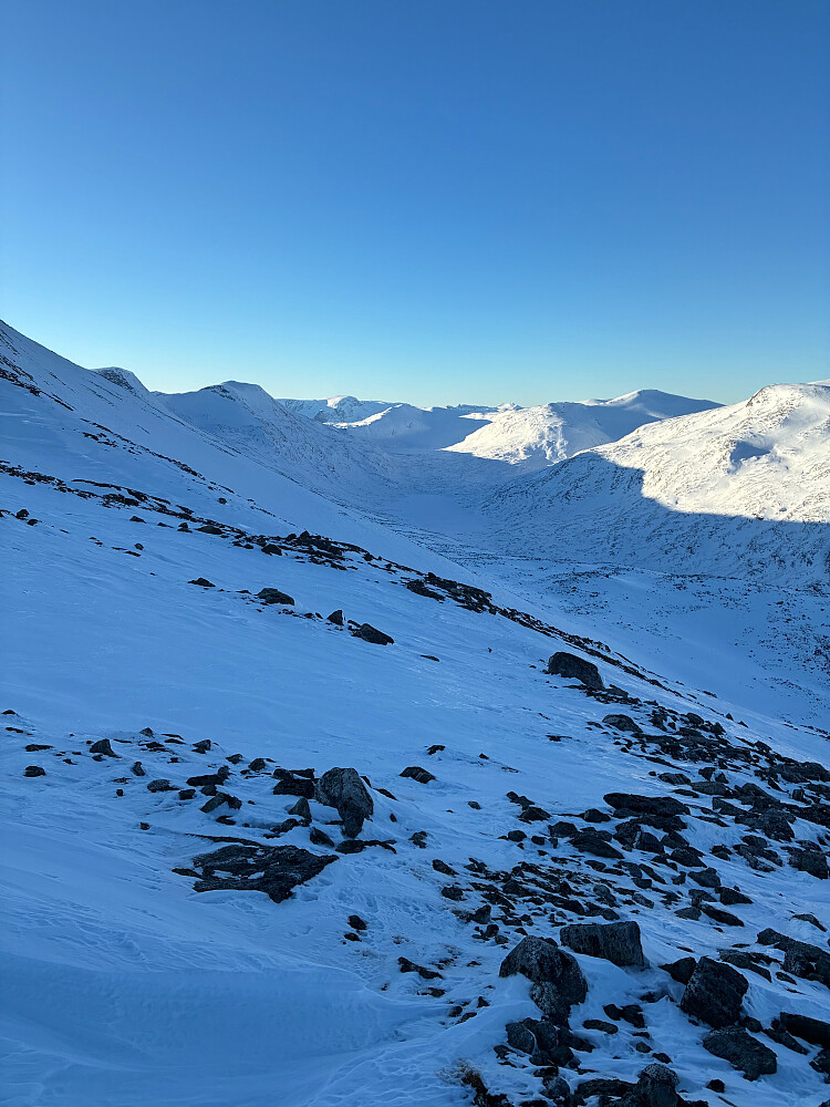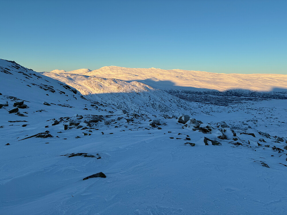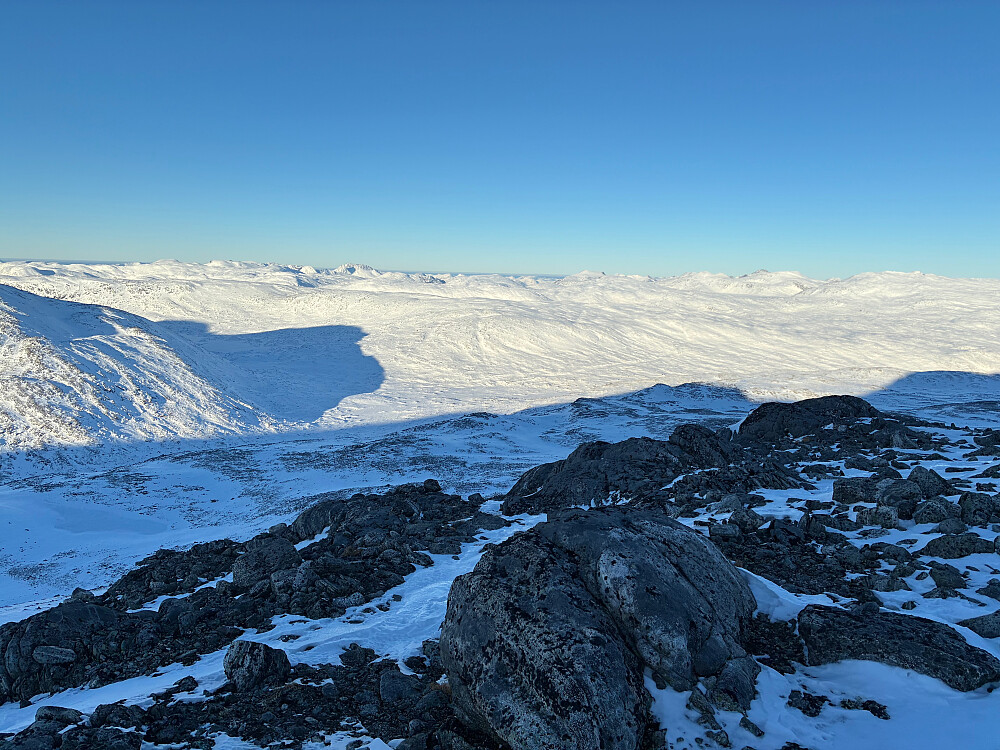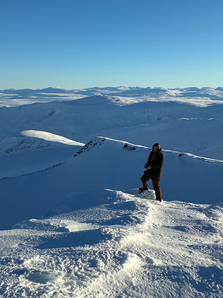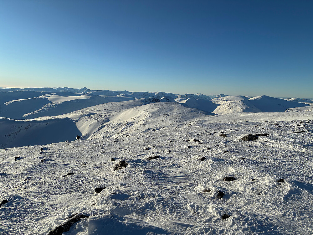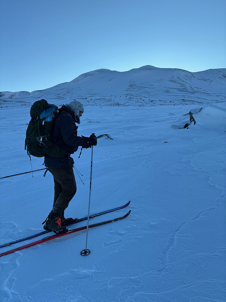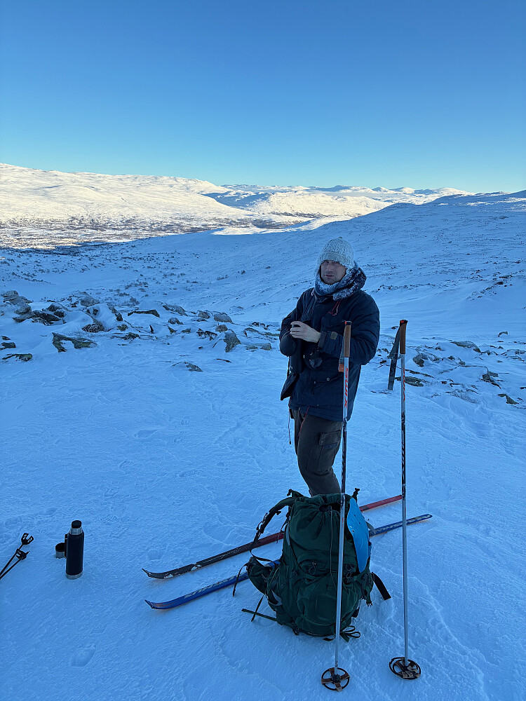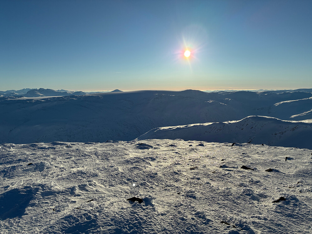 Tur med Øyvind Br. til Sandåtinden. Kjølig dag i slutten av januar. Under -25c ved start på vinterparkeringen sør for Grotli. Fulgte scooterløype opp til Heillstuguvatnet, derfra ut i terrenget. Føret var meget vindpakket og hard. Kunne nesten gått hele turen til fots uten å ha tråkket gjennom snøen. Ikke veldig mye snø i terrenget heller, men søkk og leområder var forholdsvis godt fylt igjen. Bar skiene opp kneika langs nordryggen der man kan se inn mot Sandåbreen. Oppe på platået inn mot toppen var det nokså isete med mye stein som stakk opp. Krevende skiføre, men godt å komme opp i sola. Utsikten var nydelig! Kan faktisk se helt hjem til der jeg bor i Bismo. Returen gikk forsiktig for seg pga det harde føret. Øyvind fikk en liten tur ned på baken, og den kjentes!