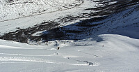 Innmarsjen gikk greit for seg i slakt terreng innover Ljotebotn. Fulgte ymse skiløyper på vei fram før vi siktet oss opp en bakke og over til utoset på vann 1350. Dette er tjernet som forsyner fossen med vann. Brukte en drøy time inn disse 3,5 km. Like før kanten der fossen stuper ned i Hydalen satte vi fra oss skiene og gjorde klart utstyret. Jeg brukte litt tid på å finne ut hvor det var best å rappellere seg ned fossen. Det er nemlig anbefalt å rappellere ned fossen før man klatrer den for å unngå >>>