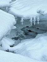 Egentur alene opp Aura fra hovedveien ved Aurmo. Forholdsvis kald dag med lave skyer og lett snø i lufta. Stort sett greie forhold oppover bekken, men tråkket gjennom en del steder der det var luft under isen, så litt guffent. To opptak før kraftverksinntaket. Først en lengde på WI2+ (frisolo), deretter litt transport før siste opptaket mot inntaket. Denne delte jeg i to og tausoloerte. Rundt grad WI3+ pga litt bratt start fra kulpen. Var en del åpent vann, så klærne og tauet ble klissvåte. Deretter lang trasking innover i juvet til Aura og Spildra møtes. Fortsatte oppover Aura. En bratt, men lengde fra en kulp (WI3+) som jeg frisoloerte. Deretter trasking inn til Høgfossen. Frisoloerte første taulengde (WI3) til en ishylle. Her måtte tauet fram, men det var fullstendig nediset >>>