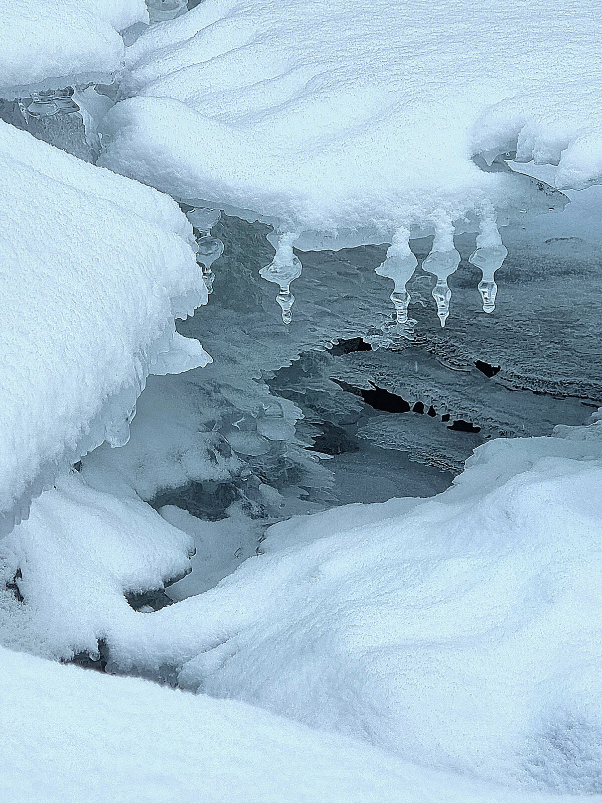 Isklatretur opp Tundre med Ida og Aud (svigermor). Parkerte i en snulomme 500 meter nedenfor Gjelbrue. Da vi kom opp til brua og skulle ta på stegjerna viste det seg at Ida sine stegjern lå igjen i Uppnåse. Jeg sprang tilbake til bilen og kjørte til Uppnåse for å hente dem (dette ble med på tracket). Vel tilbake ved brua tok vi på sele, hjelm og stegjern. Elva Tundre hadde frosset ganske bra til, men enkelte steder var det tynn is man kunne tråkke gjennom, så vær obs. Det er ikke hvert år det er mulig å isvandre opp her, men i år hadde det vært kaldt over lenger tid. Første opptak er 15 meter (WI2+). Deretter vandring et stykke før elva snevrer seg inn ved en stor kulp med overheng. I neste kulp var det åpent vann der vi ikke kom oss forbi. Løste det ved å gå litt tilbake >>>