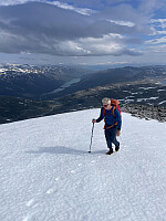 Føringstur for Øystein til Nørdre Maradalstinden. Tur/retur Skagadalshytta. Litt tåkete til å begynne med, men det letnet utover dagen. Fulgte primært snøfelter opp fra Slingsbybreen direkte mot Nørdre Maradalstinden. Jevnt over 40 graders flanke mesteparten av veien, så gjaldt å holde konsentrasjonen opp og ned. Forserte et punkt med klyving på vei opp (variant mot vest), men tok en variant lenger øst ned igjen på snø som var steinhard.
