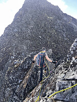Føringstur for Terje til Kvanndalstinden. Start i Vengedalen og følger sti opp til Olaskarsvatnet. Må følge med på denne stien, og fort gjort å havne for høyt opp mot Halls renne på Romsdalshornet. Møtte en kjapp amerikaner som gjorde nettopp det. Sporadisk varding bortover langs vannet. Deretter ut i terrenget og skrå opp mot breen vest for toppen. Litt rutefinning for å ikke havne i litt ekle svapartier. Pga blåis valgte vi å holde litt lavt langs en snøfonn før vi krysset selve breen. Sikkert flere plasser å klatre opp på selve ryggen, men vi holdt litt ut mot venstre langs en rampe. Sikret noen lengder opp her. Deretter lett bortover ryggen før det etter hvert bratnet til opp en markant hammer. Her er det enklest å runde litt ut mot venstre side. Først moderat klyving, >>>
