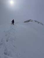 Føringstur for Øystein til Nørdre Maradalstinden. Tur/retur Skagadalshytta. Litt tåkete til å begynne med, men det letnet utover dagen. Fulgte primært snøfelter opp fra Slingsbybreen direkte mot Nørdre Maradalstinden. Jevnt over 40 graders flanke mesteparten av veien, så gjaldt å holde konsentrasjonen opp og ned. Forserte et punkt med klyving på vei opp (variant mot vest), men tok en variant lenger øst ned igjen på snø som var steinhard.
