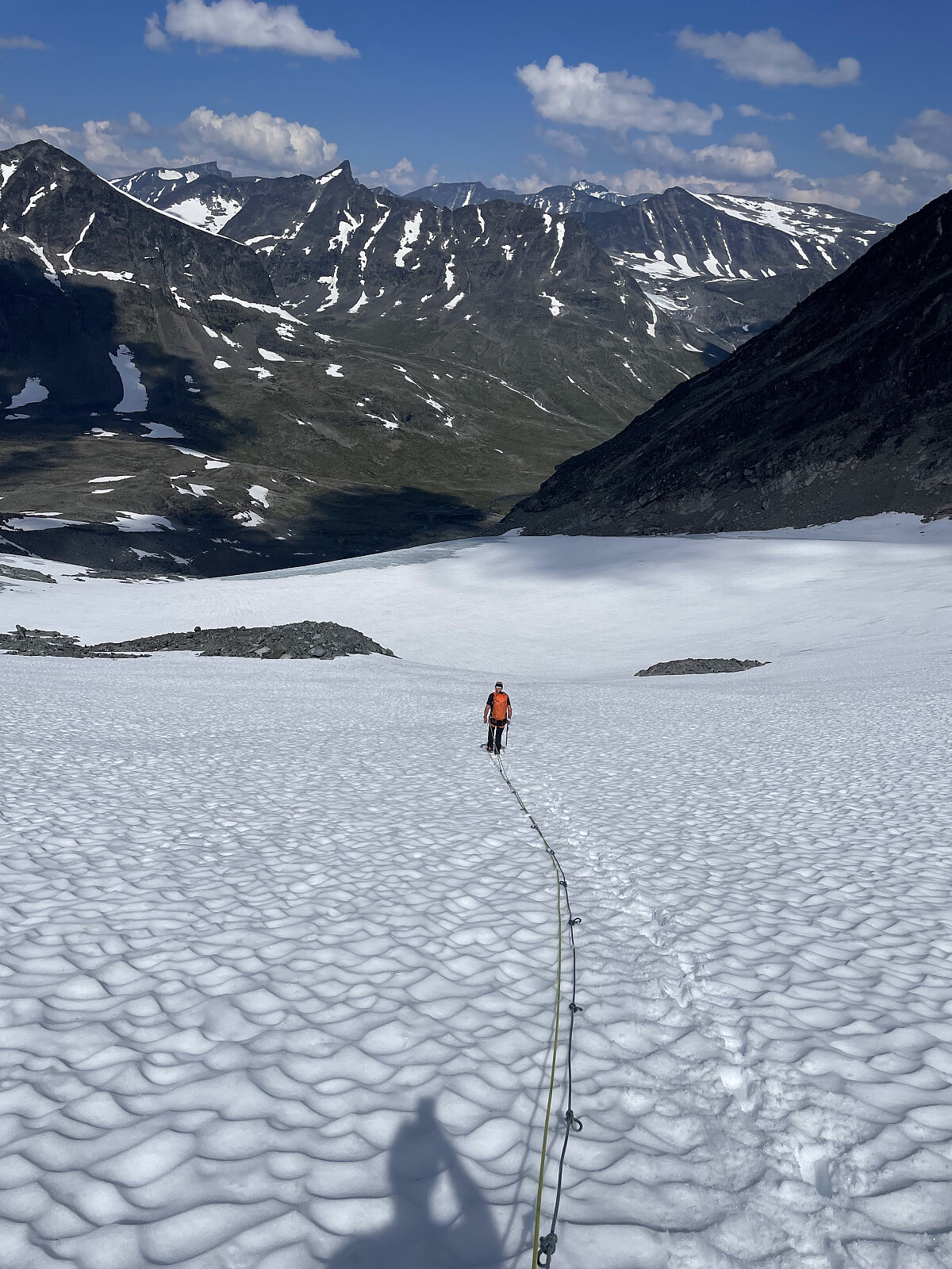 Føringstur for Gunnar over Semelholstindtraversen. Litt kronglete oppstigning mot Nørdre i nedre del. Kanskje bedre å holde lenger mot øst og runde det bratteste? Morsom travers med flere eksponerte punkter. Litt køddent å finne egnet standplass etter siste taulengde før toppen, men måtte forlenge fra sikringer over kanten mot sør. Sikksakket oss en del på breen ned igjen for å holde oss på snø og slippe stegjern på is.