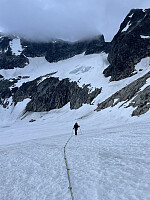 Føringstur for Gunnar over Semelholstindtraversen. Litt kronglete oppstigning mot Nørdre i nedre del. Kanskje bedre å holde lenger mot øst og runde det bratteste? Morsom travers med flere eksponerte punkter. Litt køddent å finne egnet standplass etter siste taulengde før toppen, men måtte forlenge fra sikringer over kanten mot sør. Sikksakket oss en del på breen ned igjen for å holde oss på snø og slippe stegjern på is.
