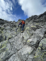 Føringstur for Terje til Eggen. Start fra Vargebakken og fulgte sti opp til Bukkehåmårtjønne. Herfra gikk resten av ferden uten sti. Opp fra vestenden av tjernet fulgte vi sporadiske varder og fant en fin trasé opp mot pkt 1899. Rundet deretter Kvassryggen på nordsiden på fine hyllesystemer. På vei inn til breen nord for Høgdebrotet fant tok vi et litt dårlig veivalg på vei fram pga mye morenemasser. Bedre der vi gikk tilbake selv om det krever litt mer høydemeter. Lå litt snø i høyden som var i ferd med å smelte. Veldig glatt der det var mosedekt. Gikk greit å krysse breen uten stegjern. Tok på klatreutstyret på den andre siden. Greit å ta seg opp på ryggen fra breen. Opp sørryggen klatret vi det i tre taulengder med 30 meter tau, med litt tautransport i midten. Kan muligens >>>
