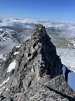 Føringstur for Svein over Austanbotntindtraversen i nydelig vær. Startet fra "vinterparkeringa" siden det var rikelig med snø på utmarsjen. Fant ut at jeg kunne ha kjørt inn og parkert i endeveien 400 meter lenger sør for vår parkering. Greit å vite til senere. Fine forhold over traversen. Vi klatret direktevarianten opp til sørtoppen i to taulengder. Litt småvått et parti, men klarte å bryte oss opp. Måtte fram med stegjerna ca. 30 meter langs en snøegg etter sørtoppen, men ellers hadde vi ikke bruk for dem.