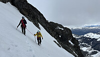 Føringstur for Øystein til Nørdre Maradalstinden. Tur/retur Skagadalshytta. Litt tåkete til å begynne med, men det letnet utover dagen. Fulgte primært snøfelter opp fra Slingsbybreen direkte mot Nørdre Maradalstinden. Jevnt over 40 graders flanke mesteparten av veien, så gjaldt å holde konsentrasjonen opp og ned. Forserte et punkt med klyving på vei opp (variant mot vest), men tok en variant lenger øst ned igjen på snø som var steinhard.