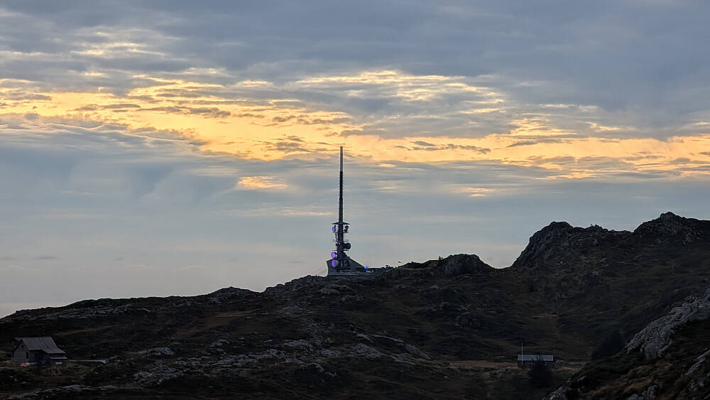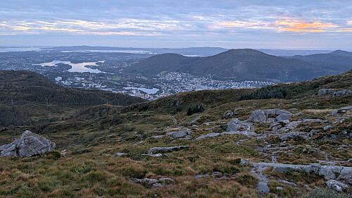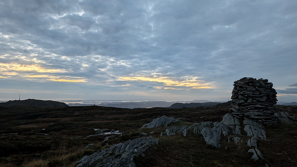 Nådde toppen i skumringa, med utsikt tilbake mot Ulriken.