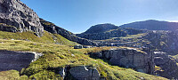 Årets avstikkar frå Vinjerock Med lettare oppakning og betydelig betre dagsform enn under fjorårets Vinjerock tur ( Mjølkedalspiggen ), gjekk turen i år saman med Magnar til Slettmarkpiggen via Slettmarkkampen. Med godt over 20 grader og steikande sol la vi i veg i god driv mot Høystakkane. Som mange andre toppar i området var det ein god anmarsj inn til denne toppen også, men i veldig lettgått terreng. Ved brua over Høystakka vart det påfylling av vatn. Vatnet i elva var nesten lunka, og vi vart litt skuffa etter å ha gleda oss til friskt kaldt fjellvatn. Heldigvis var det mange muligheta for påfylling av kaldt vatn vidare på turen. I stikrysset ved Uksedalen tok vi av mot Torfinnsbu, og følgde stien ca. 1,5 km før vi kryssa elva. Vi klarte å krysse elva nogelunde tørrskodd, takka vere gore-tex.