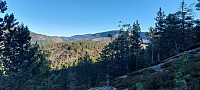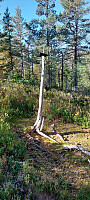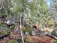 Tok en traktor vei inn til høyre og gikk opp bakken ved en gammel sag. Fulgte traktorveien vestover. Gikk ettehvert over til mer ATV spor og sti. Denne endte ved en stang for plassering av salt til vilt. Herfra ble det busking i lyng opp til toppen. Igjen flott utsikt ned til Espestøyl og vidre sørover mot Eikhom.