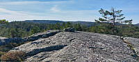 Syklet forbi bommen og oppover. Litt bakke i starten for så å flate ut. Etter 1 kilometer ved Trolltjønn satt jeg sykkelen i veikanten og fulgte fin sti oppover lia. Her er det og litt bratt i starten. Stien er ikke merket. Etter hvert ble det mer svafjell. Det er satt opp små varder og merkesteiner så det var lett å finne veien opp til toppen. Varde og kasse med bok på toppen. Fantastisk utsikt i alle retninger.