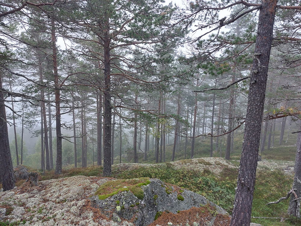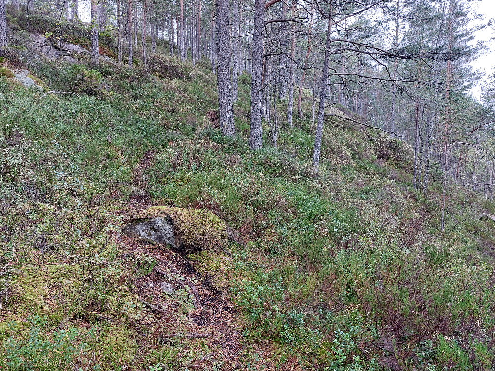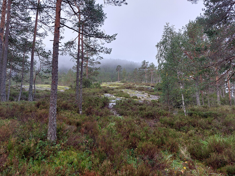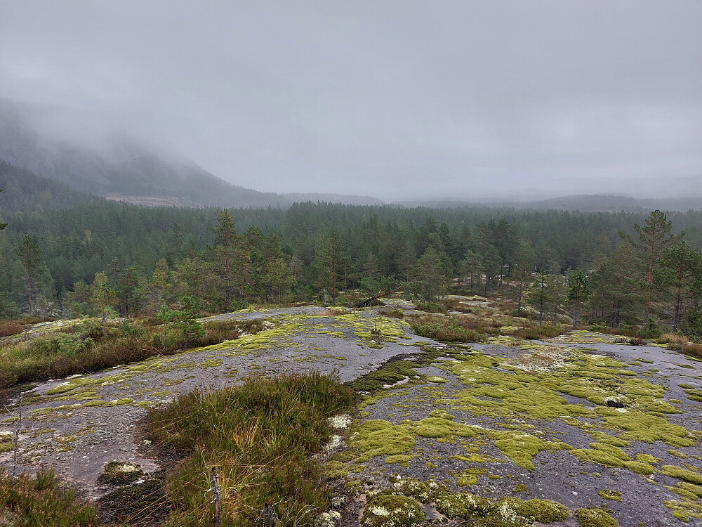 Syklet opp grusveien til hytta. Satte sykkelen i veikanten etter hytta og gikk opp svaet. Fant en sti som tok meg opp gjennom skogen. Plutselig var stien borte og det ble busking i lyng rettning toppen. Møtte fjellveggen og måtte trekke mot høyre for å finne vei opp. Kom da inn på sti/tråkk opp det bratte partiet. Derfra 100 meter i lyng bort til toppunkt. Skogtopp. Det var tåke så jeg gadd ikke gå for å finne noe utsiktspunkt. Derfor ble det raskt retur samme vei ned til sykkel og bil.
