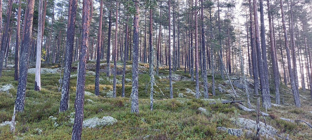 Tok til venstre i veikrysset med en hytte og fulgte vegen noen 100 meter til det gikk en gammel gjenngrodd traktorslepe oppover. Fulgte den oppover til endes og gikk litt opp i terrenget til høyre. Derfra var det lettgått terreng i blåbærlyng og furuskog helt til topppunktet.