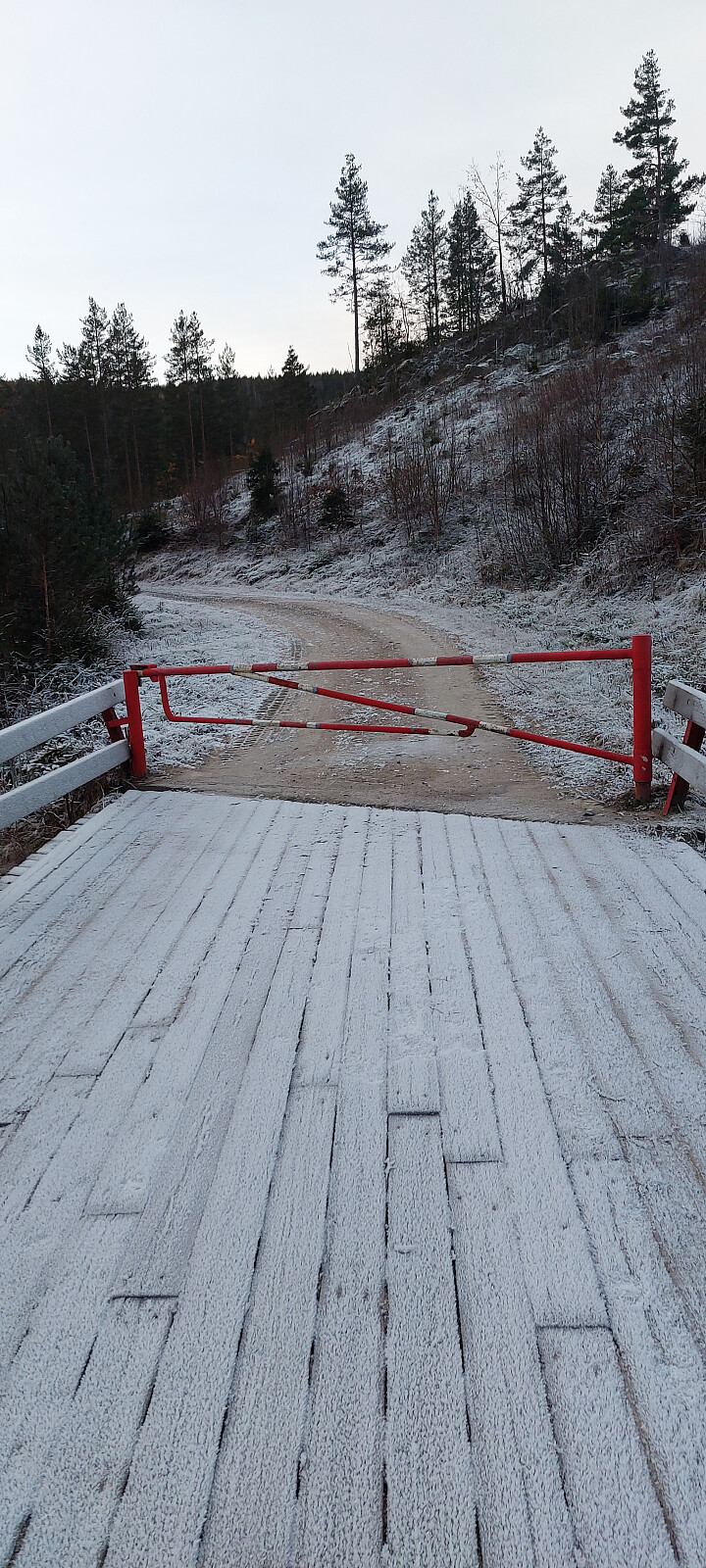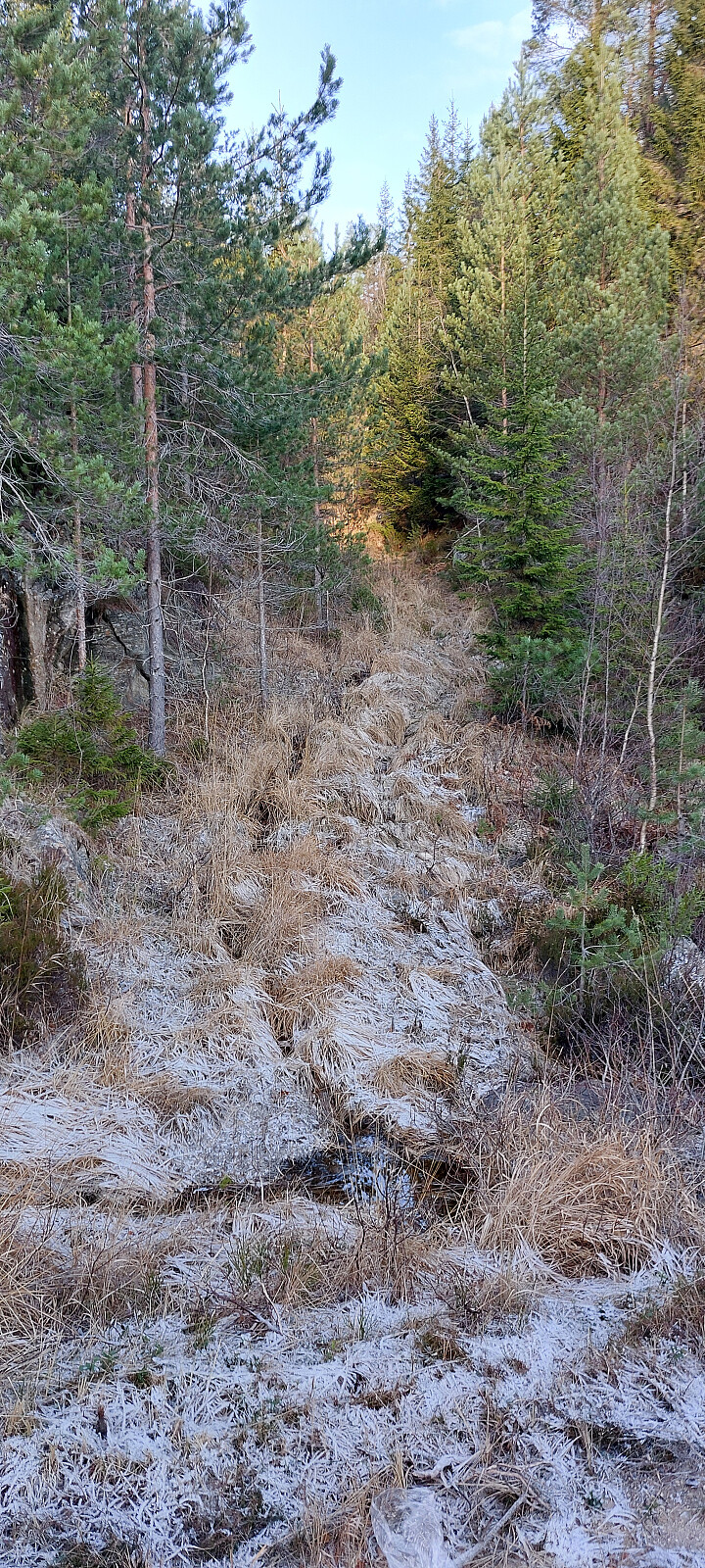 Ankom Høydalen parkering på en kald rimete morgen idet solen begynte å lyse på toppene. Syklet innover Høydalsvegen. Bommen stod åpen. Fulgte Høydalsvegen og deretter Sannavegen i 4,3 kilometer. Tok til venstre inn på Bømarkvegen og krysset Sannaelva på bru. Her har de plassert bommen mellom gjerder på brua, så sykkelen måtte løftes over. Fulgte Bømarksvegen i 6,2 kilometer. Så langt greit å sykle, ikke de bratteste bakker. Tok av fra opp til høyre og herfra til toppen måtte jeg av sykkelen, for her ble det bratt. Fulgte veien til rett under toppen. Hadde nå syklet 12,4 kilometer fra Høydalen. Valgte å følge en gammel traktorslepe opp retning toppen. Viste seg å være en bratt skrent mellom meg og toppen. Med litt klyving kom jeg opp. Deretter lynbgbusking opp til toppen. Denne er markert med rester etter ett trig.merke. Grei utsikt. Retur for å unngå bratte skrenter. Fant en sti ned som kom ut på veien 30 meter ovenfor der jeg gikk opp. Anbefaler sporet ned også for opp. Rullet raskt nedover og tilbake mot Middagskollen.